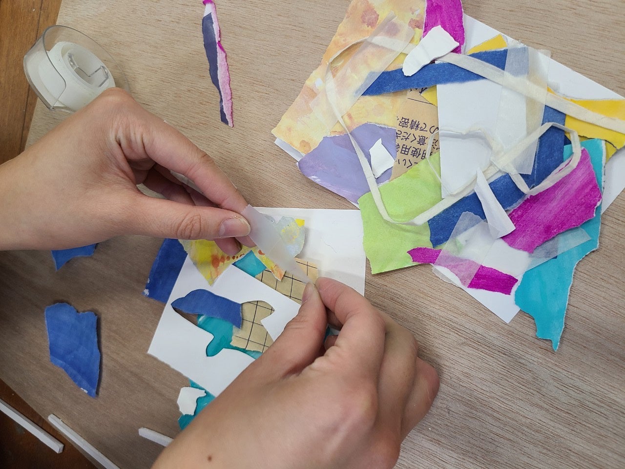 美大生が作品制作で使っている素材の切れ端を使いポストカードを作ります。普段あまり触れることがない、絵画作品を構成