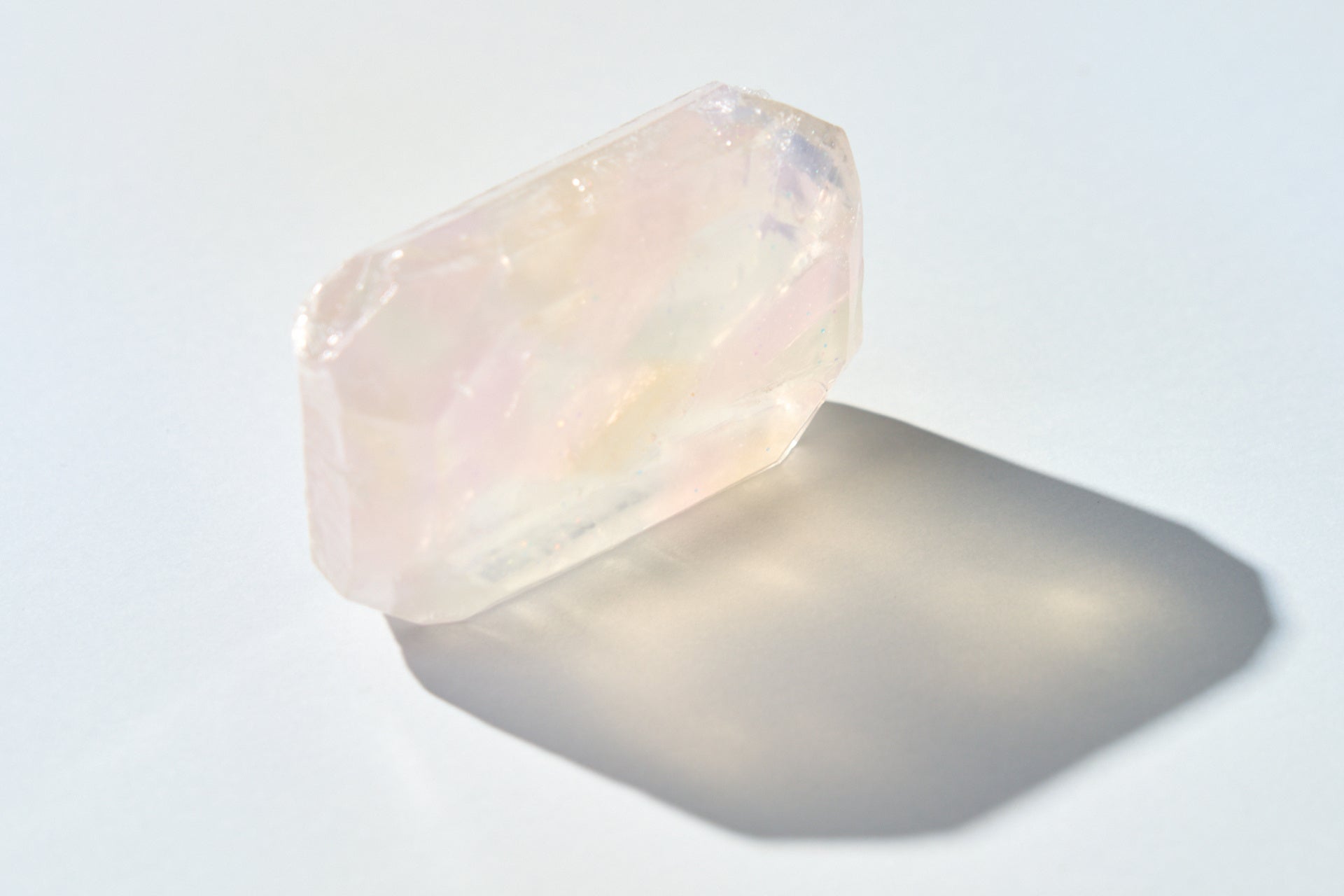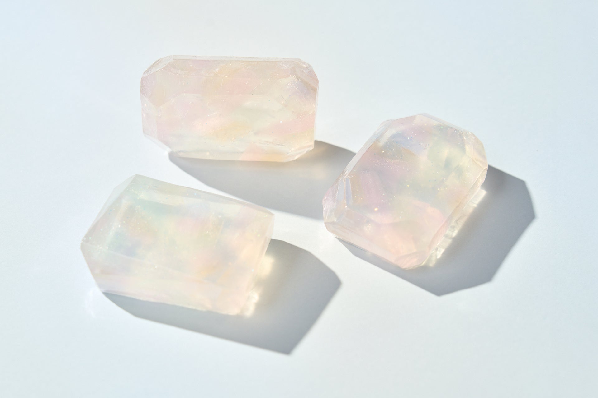 オーロラクォーツは、水晶に加工を施すことで生まれる 繊細な光沢と透明感を持つクリスタルです。 その“内側からにじむような輝き”を、 宝石石鹸ならではの質感で表現しました。天然石のきらめきと香りで、毎日の洗う時間を特別に。