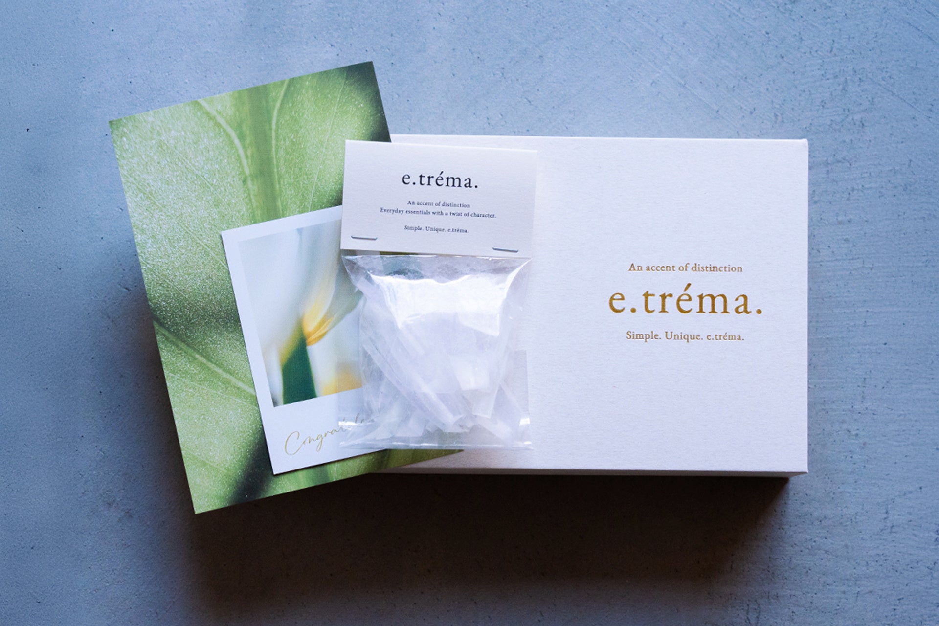 e.tréma.の「e」はエレガント (elegant) や特別な (exceptional) の頭文字。「tréma」は分離のシンボルであるため、「他にはない特別な美しさ」を表すブランドコンセプト。