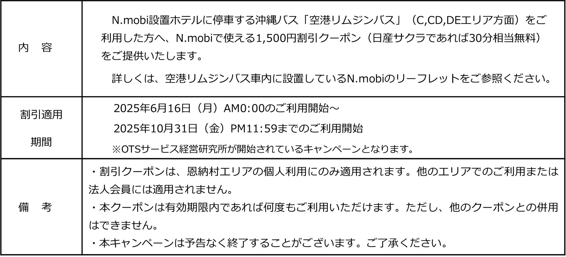N.mobiのEVカーシェアステーションが設置されている恩納村エリアのホテルまでは、沖縄バス株式会社が運行する「空港リムジンバス」でアクセスが可能です。旅先のご移動を空港リムジンバスとEVカーシェアのセットで利用いただくことで、一人あたりの輸送に関わるCO₂排出量の削減に貢献できます。N.mobiは、今後も沖縄県内のバス事業者と連携し、相互の利用促進に繋がる取り組みを推進します。
