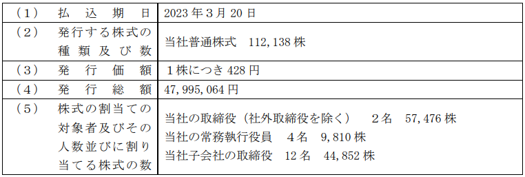 譲渡制限付株式報酬としての新株式の発行に関するお知らせ