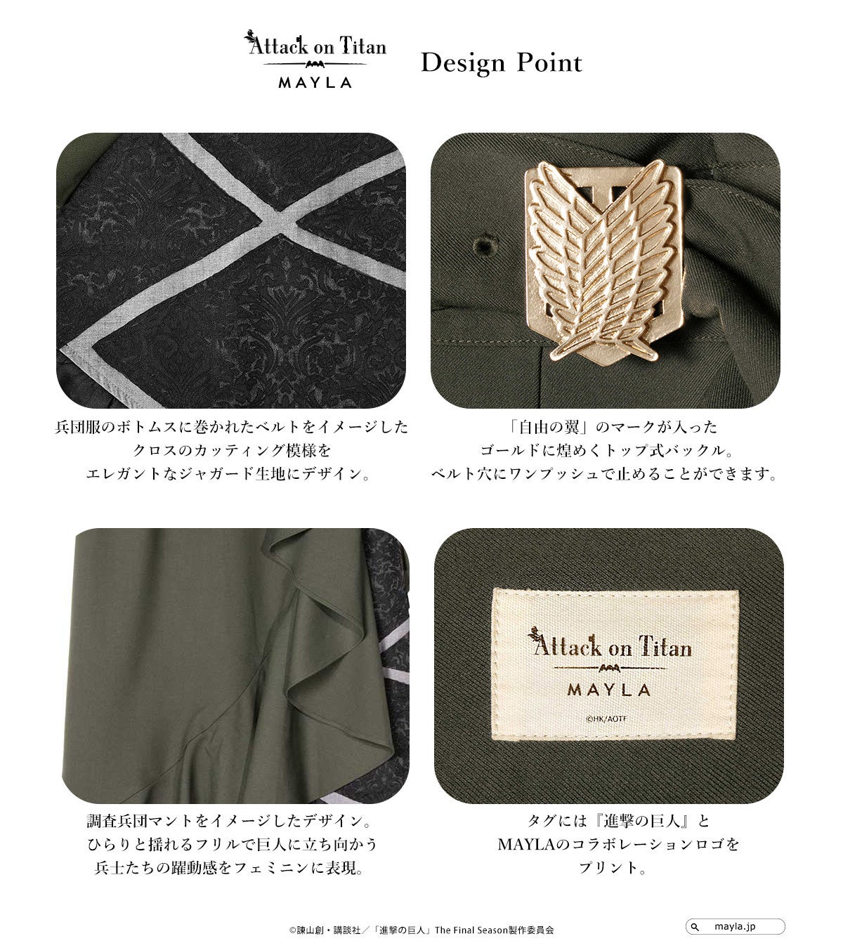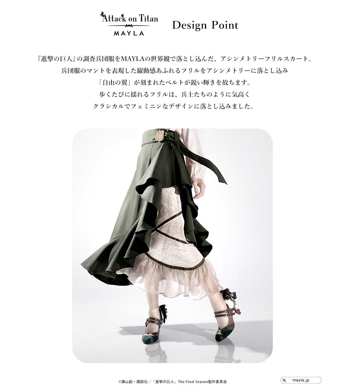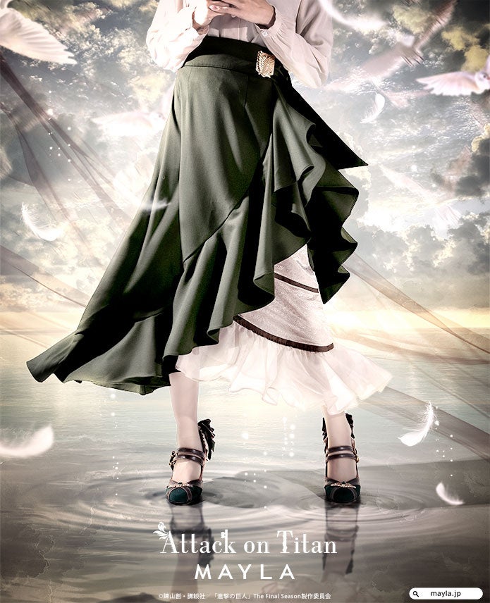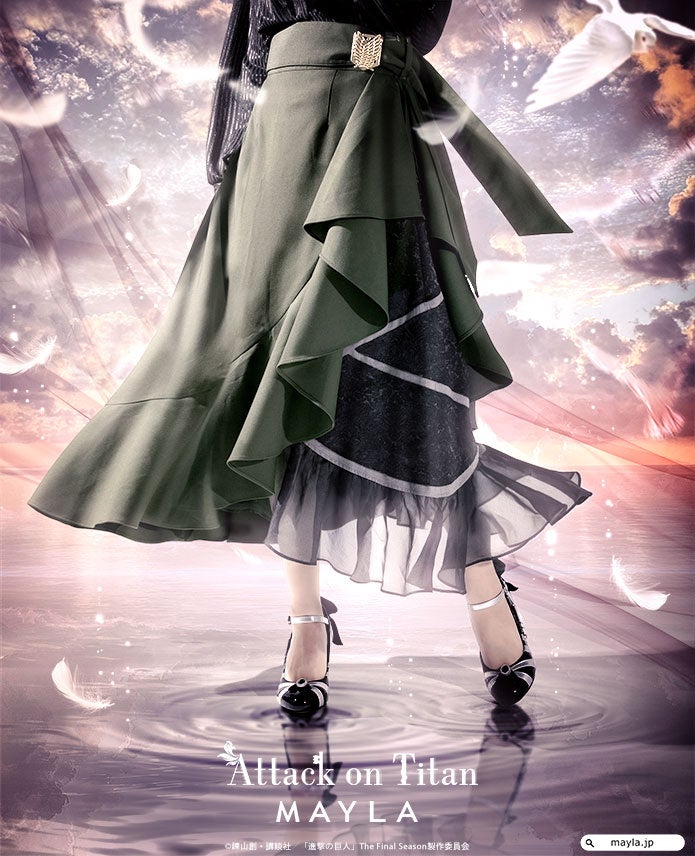 この度、MAYLAはTVアニメ『進撃の巨人』に登場する、調査兵団が着用している兵団服をイメージしたアイコニックなスカートをプロデュースしました。「自由の翼」が刻まれたベルトや、兵団服のマントを表現した躍動感あふれるアシンメトリーなフリルなど、世界観をたっぷり詰め込んだアイコニックでフェミニンな1着です。
