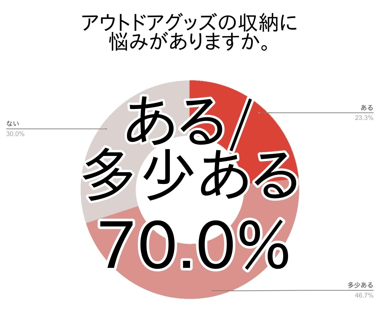 今回のアンケートでは、アウトドアグッズの収納に悩みがある/多少あると答えた方は全国的に約7割(関東70.0%・全国73.1%)でした。