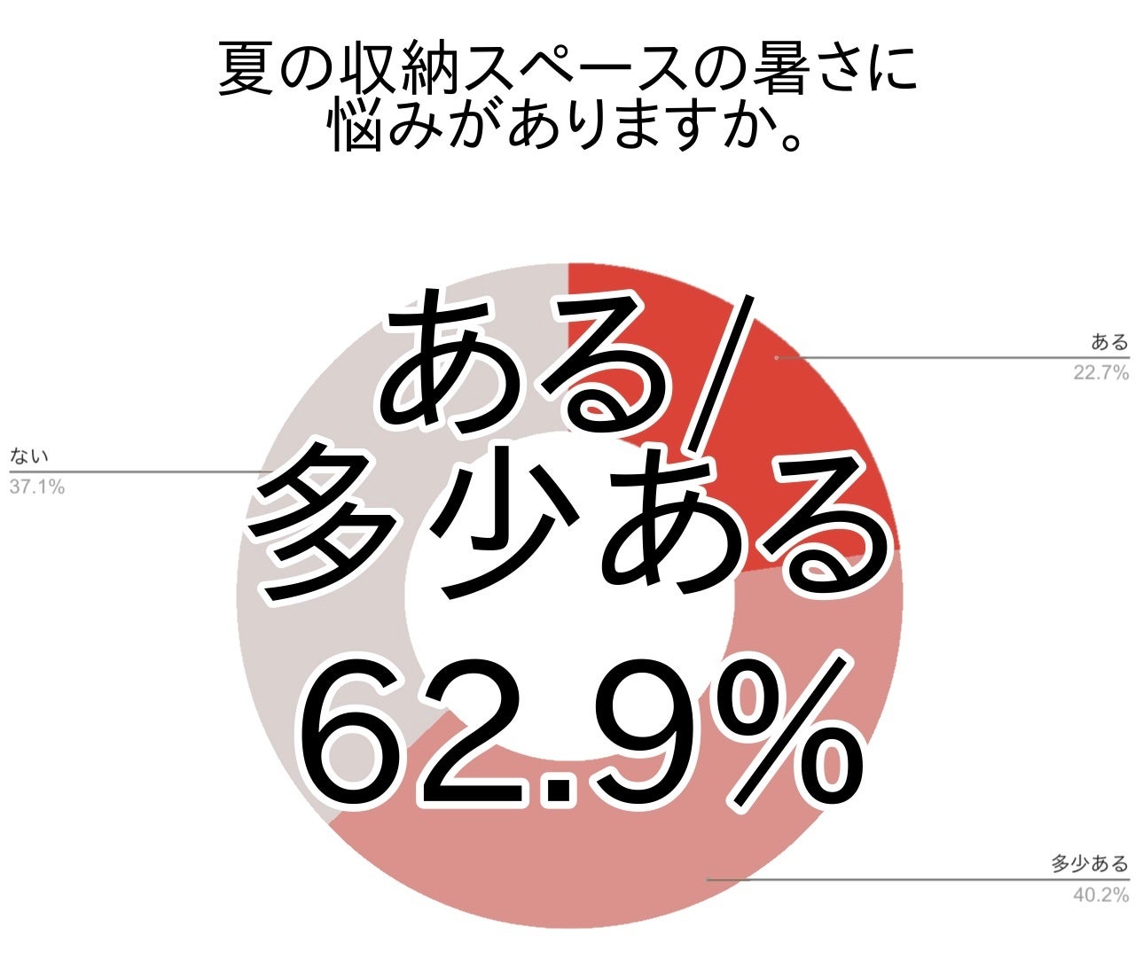 今回のアンケートでは、夏の収納スペースの暑さに悩みがある/多少あると答えた方は合わせて6割台(関東62.9%・全国66.0%)でした。