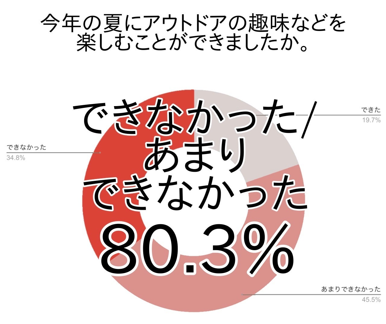 今回のアンケートでは、今年の夏にアウトドアの趣味などを楽しむことができなかった/あまりできなかったと答えた方は関東で約8割(80.3%)・全国で約7割(72.0%)でした。