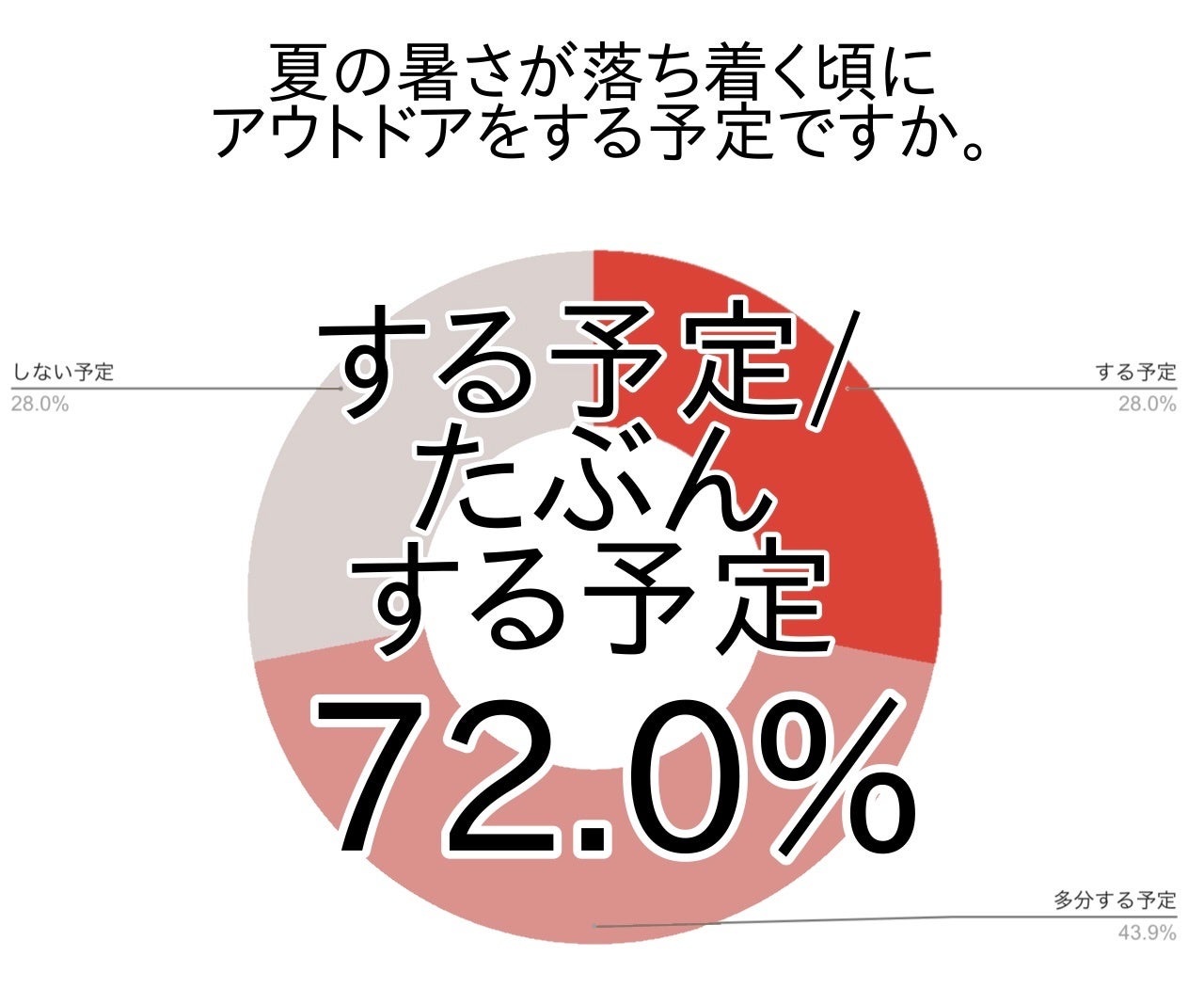 という結果で、「する予定」が約3割、未確定だが「たぶんする予定」が約4割でした。涼しくなり、気持ちのいい季節を感じながらアウトドアがしたいと考えている方が多いようです。