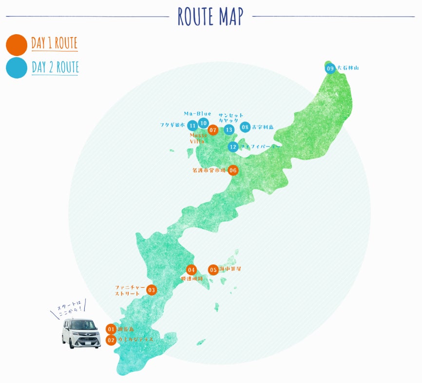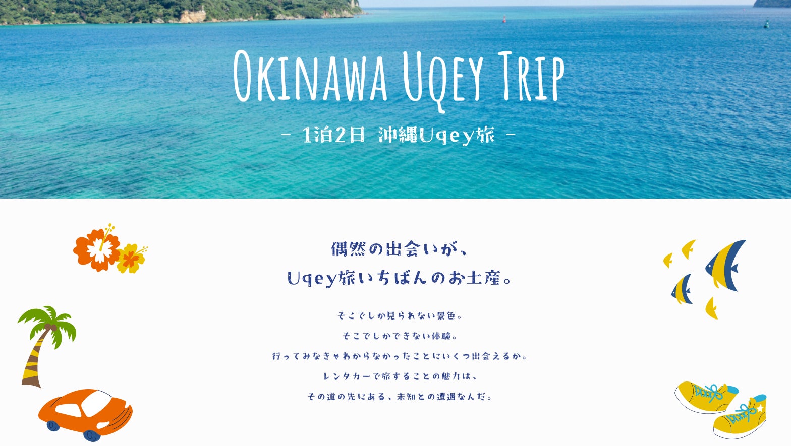 レンタカーを利用した1泊2日の旅行プランをご提案しています。沖縄県には定番スポットから隠れ家的なスポットが盛りだくさん。基本プランは考えながらも、レンタカーを利用した“Uqey旅でしか出会えない沖縄”をお楽しみください。写真映えするフォトスポットも紹介中です。