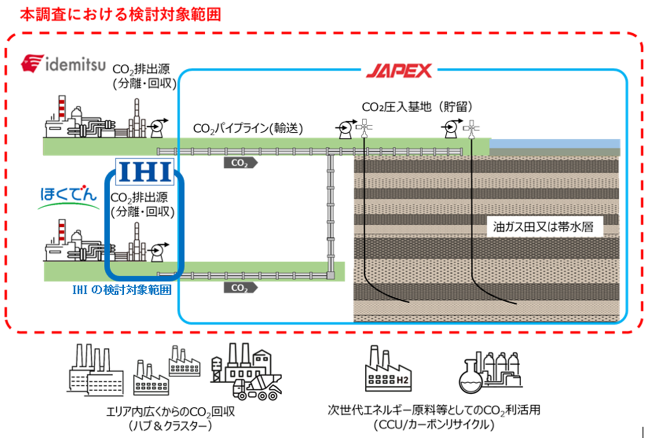 本検討は,北海道電力が石油資源開発,出光興産と共同で受託した,独立行政法人エネルギー・金属鉱物資源機構(JOGMEC)の令和5年度 「先進的CCS(*)事業の実施に係る調査」に関する委託調査業務において実施する「北海道・苫小牧エリアにおける CCS 実現可能性調査」(以下,「本調査」)の中で,北海道電力が担当する検討対象の一部をIHIへ再委託して取り組むものです。