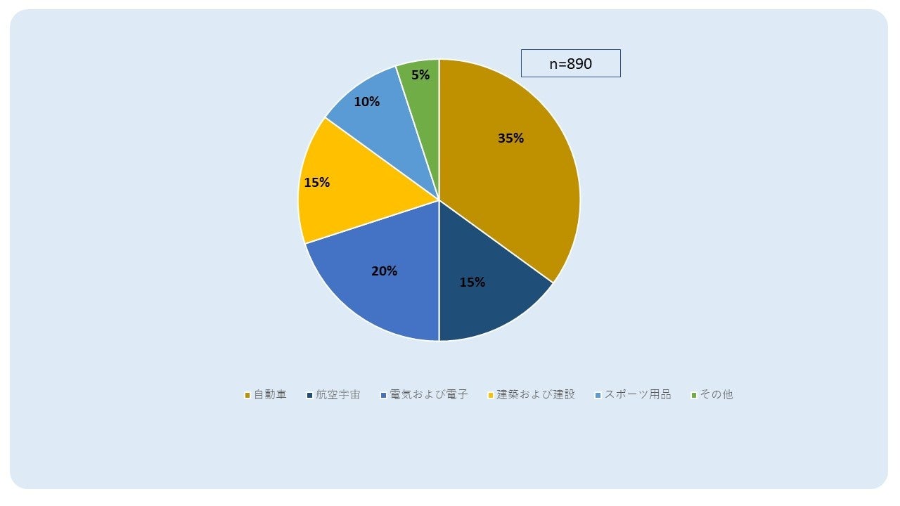 - エンドユーザーに関しては、長繊維熱可塑性樹脂の使用量が最も多いのは自動車産業 (35%)、次いで電気・電子機器 (20%)、建築・建設 (15%)、航空宇宙 (15%)、 スポーツ用品(10%)となり、 残りの 5% はその他のセクターです。