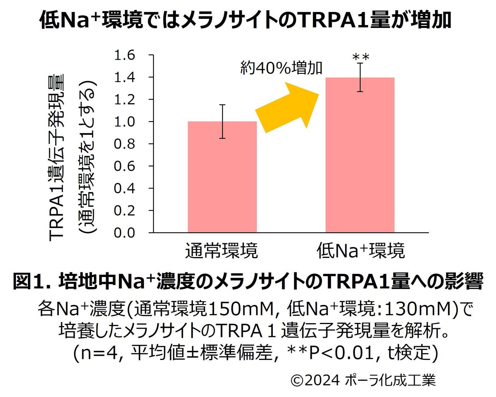 メラノサイトは、低Na+環境下だと、 持続型即時黒化のキー因子のひとつであるTRPA1(※1)が増加し、UVAの刺激により即座にメラニンを作りやすい状態になっていること。