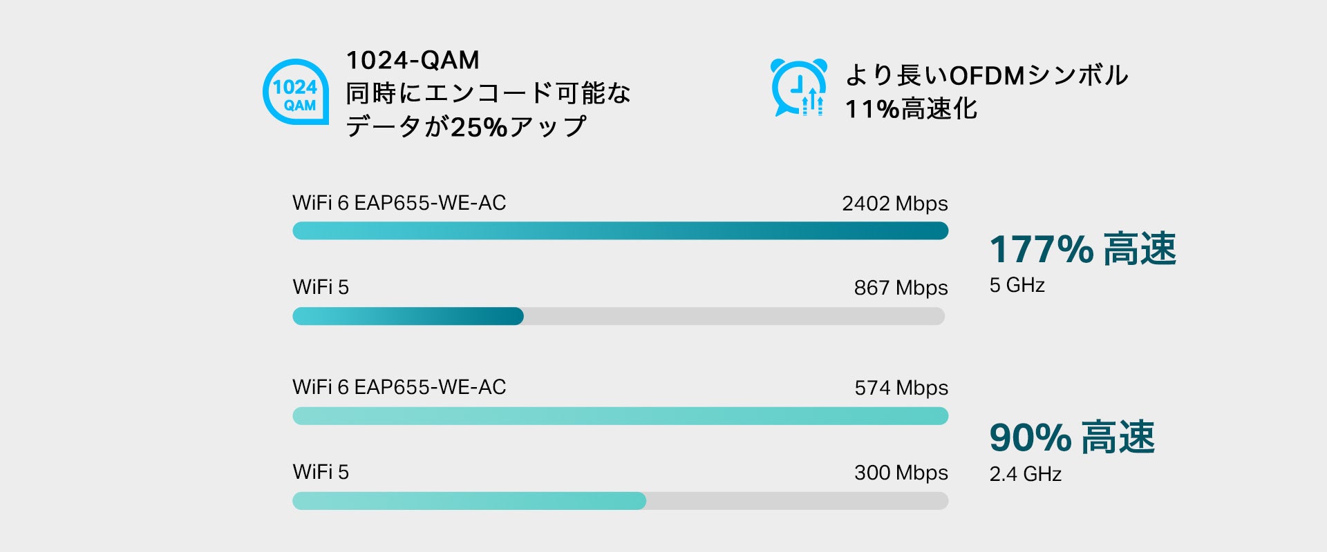 合計最大速度2976Mbps (5GHz:2402Mbps + 2.4GHz:574Mbps) のWi-Fi 6通信を提供し、マンションやホテルの各客室へ設置した場合でも安定したネットワーク接続をサポートします。