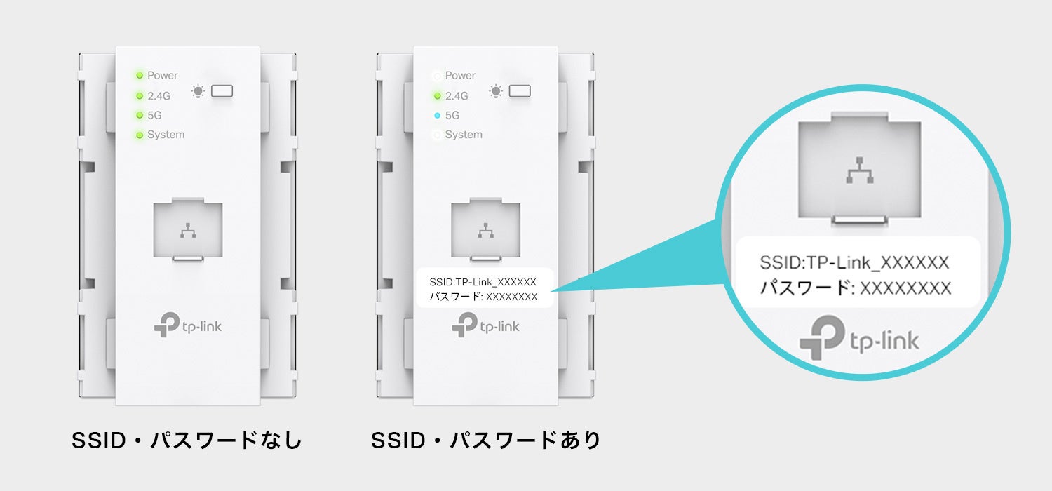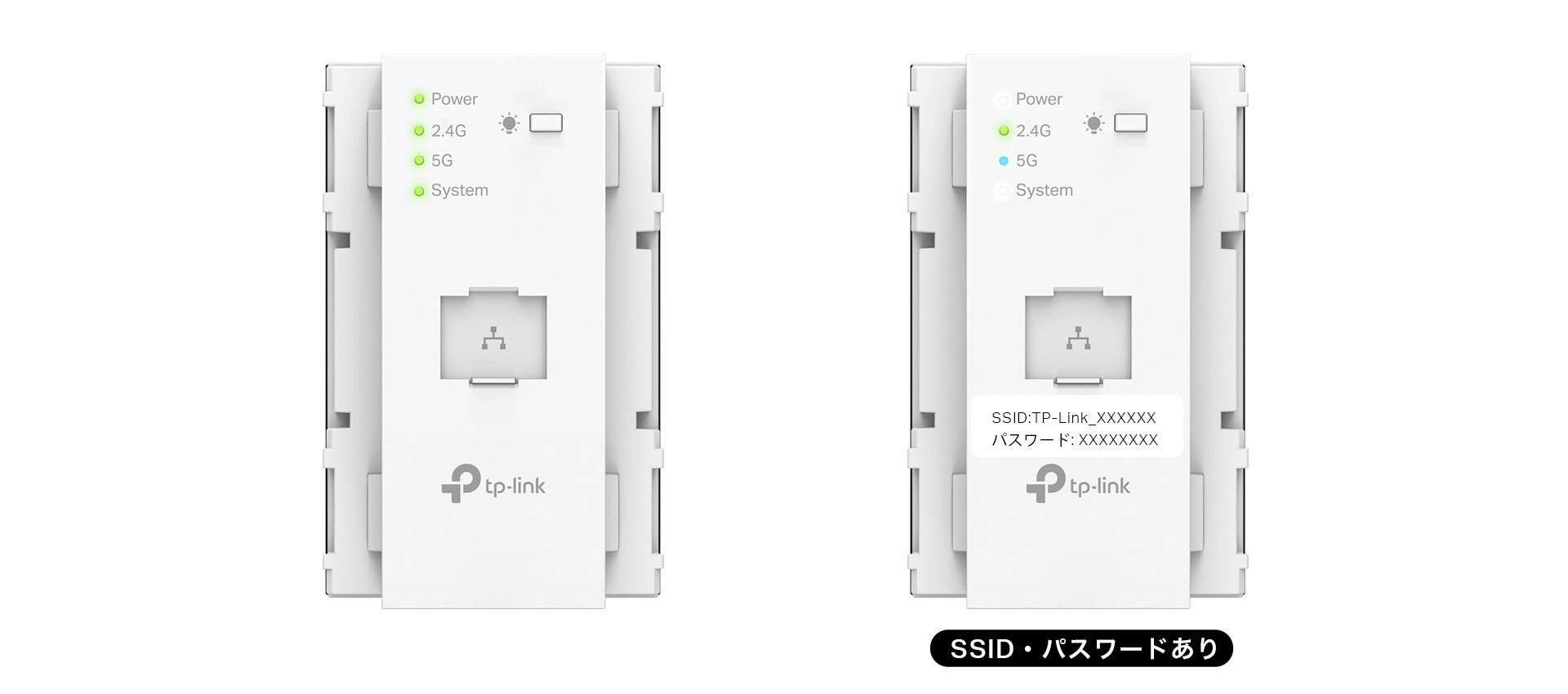 Wi-Fi 6テクノロジーに対応し、合計2976 Mbps (5GHz: 2402Mbps + 2.4GHz: 574Mbps) *1の高速通信を実現します。また、TP-Linkのコンセント埋め込み型アクセスポイントには、SSIDとパスワードが表面に記載されている型番と記載されていない型番がございます。使用環境に応じて柔軟に選択することで運用の幅が広がります。