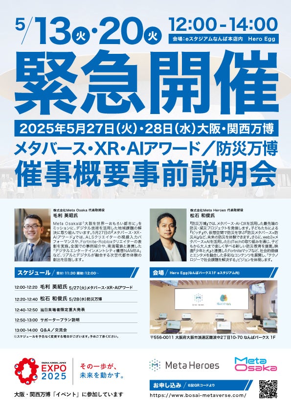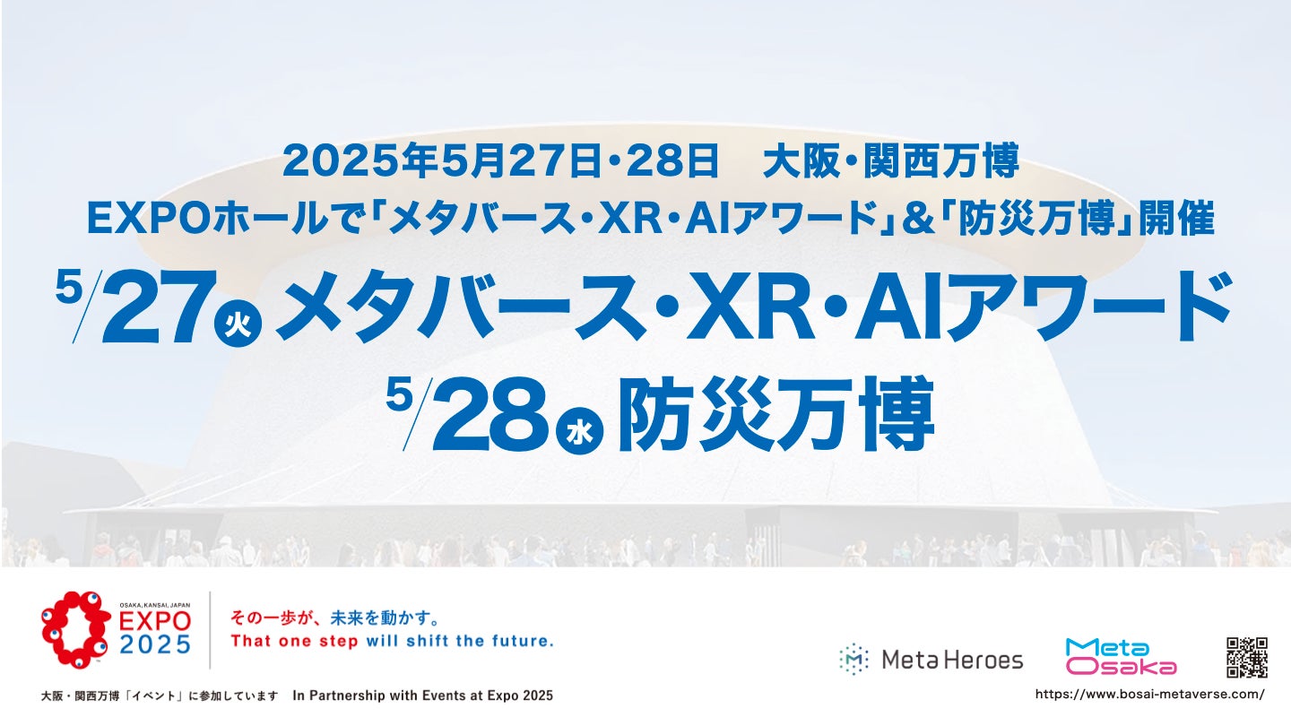 2025年5月8日、株式会社Meta Heroes(本社所在地:大阪府大阪市、代表取締役:松石和俊、以下「当社」)は、グループ会社である株式会社Meta Osaka(本社所在地:大阪府大阪市、代表取締役:毛利英昭)と共催で、025年5月27日・28日に開催予定の「メタバース・XR・AIアワード」および「防災万博」に向けた事前説明会を開催いたしました。
