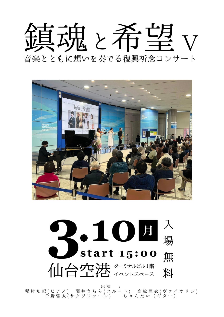 今年も、この時期のみ仙台空港に設置される「復興空港ピアノ」を用い、サクソフォーン奏者・千野哲太、ヴァイオリニスト・高松亜衣をはじめ、ピアノ、フルート、ギターの各奏者が仙台空港にて演奏いたします。被災地の皆様への祈りを込めた楽曲などの演奏を通じて、それぞれの想いを音楽にのせ、復興への願いを届ける特別なひとときとなるでしょう。