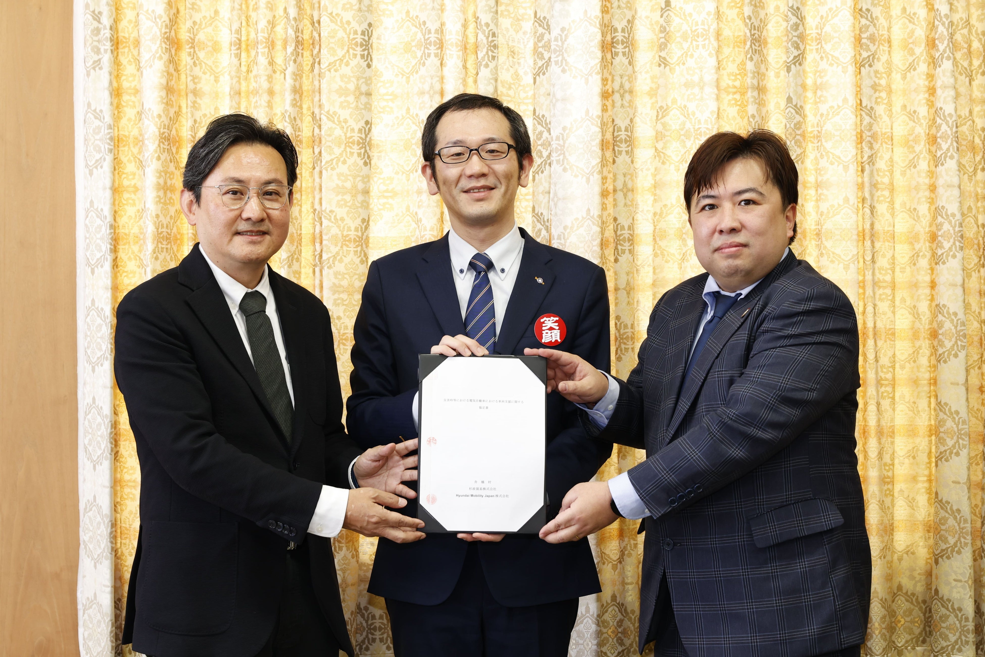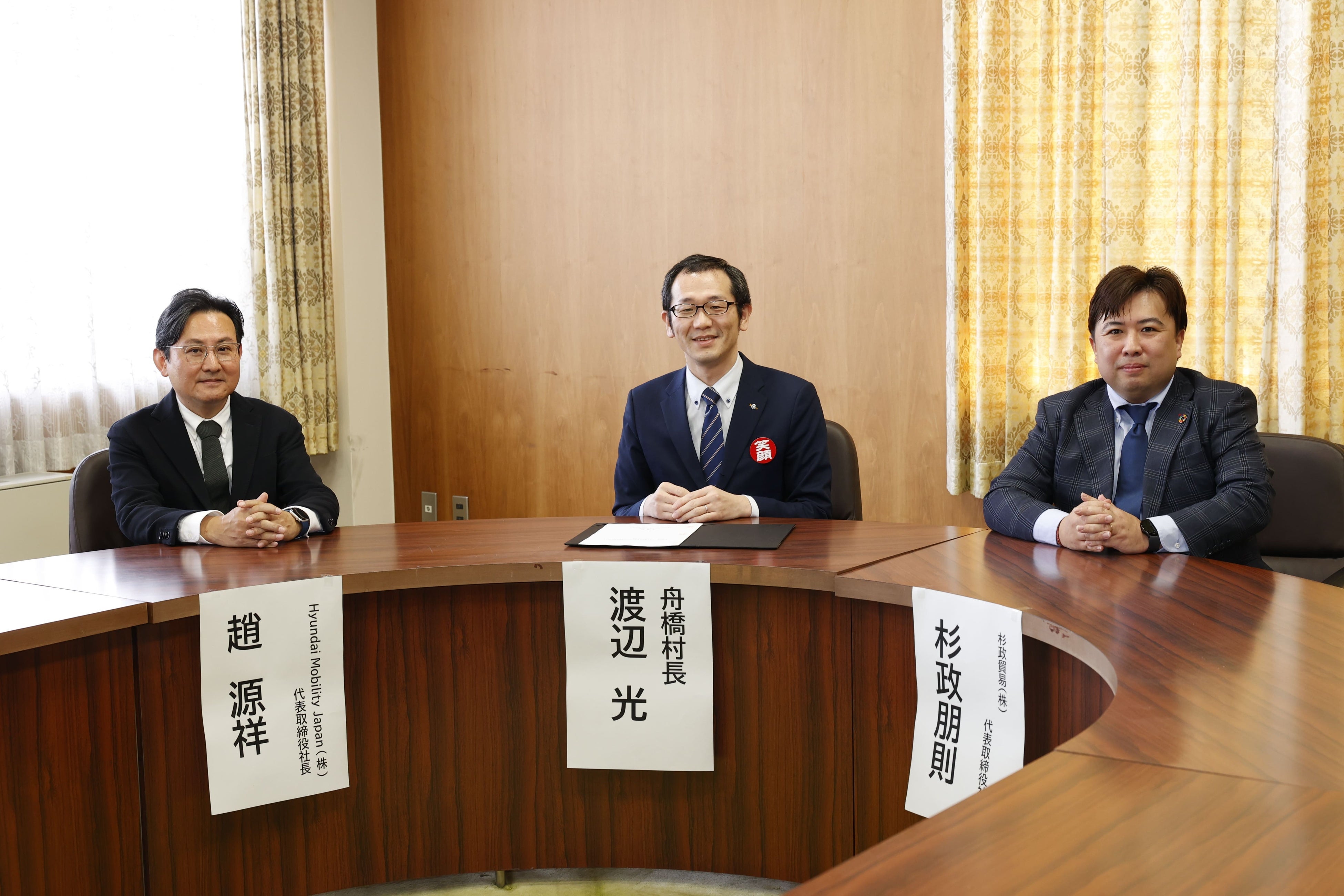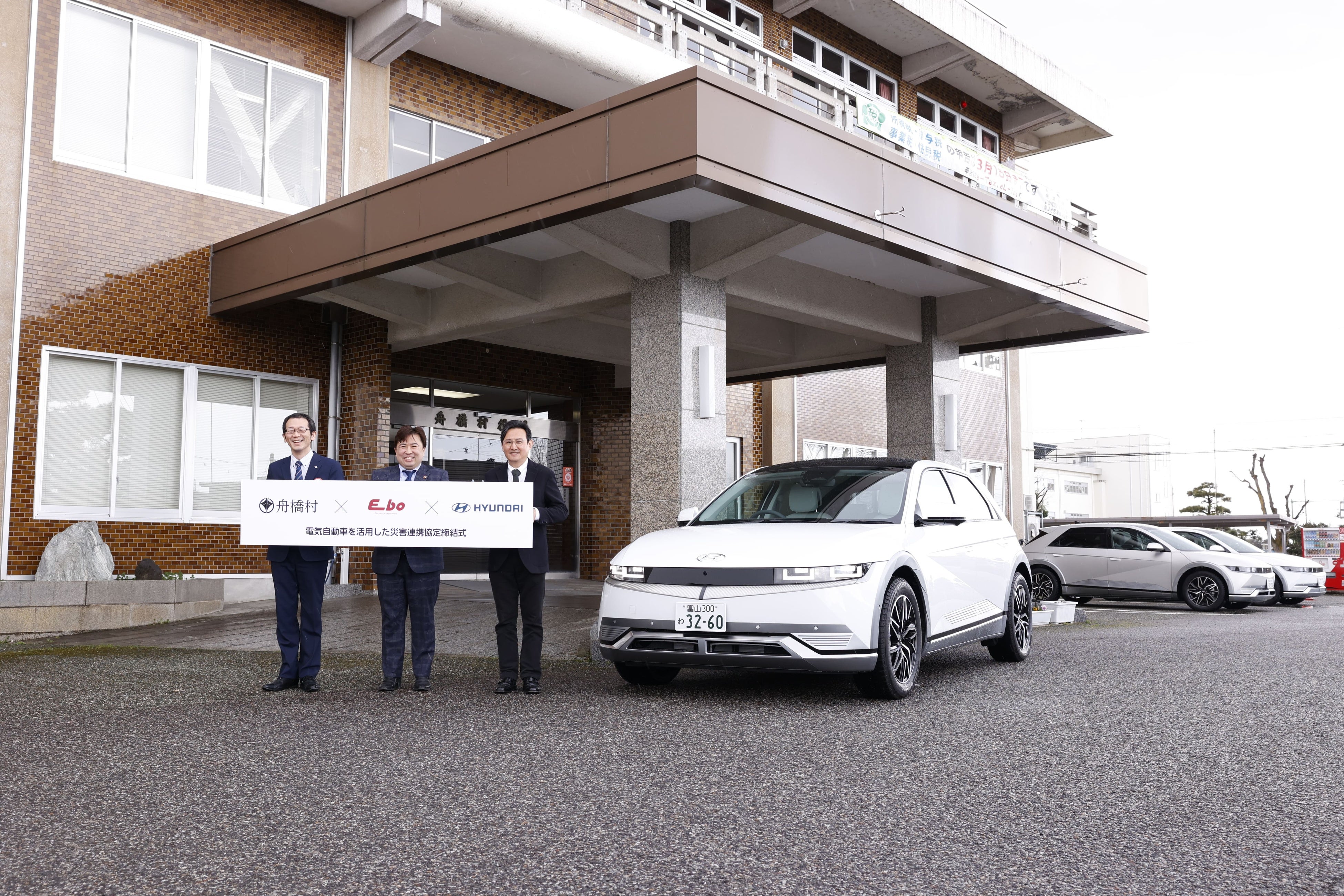 Hyundai Mobility Japan株式会社(神奈川県横浜市西区みなとみらい 代表取締役社長:趙 源祥/以下、Hyundai)、杉政貿易株式会社(富山県富山市田中町、代表取締役;杉政朋則/以下、杉政)は、2024年2月27日(火)に、富山県舟橋村(村長:渡辺光)と『電気自動車を活用した災害連携協定締結式』を行いました。