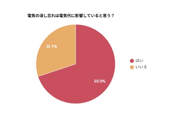 電気の消し忘れが電気代に影響しているかを聞いたところ、「はい」と回答した方は69.9%にのぼりました。一方で、「いいえ」と回答した方は30.1%にとどまっています。この結果から、約70%の方が消し忘れが電気代に影響していると感じていることが分かります。