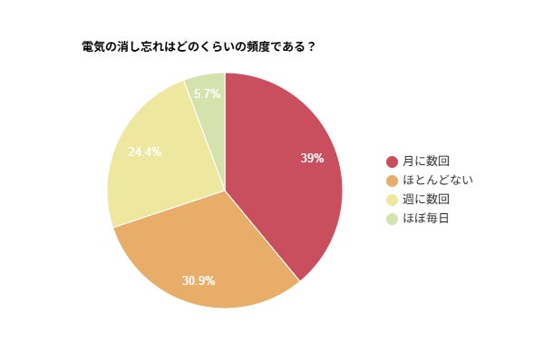 電気を消し忘れる頻度は「月に数回」が最も多く39%でした。「週に数回」が24.4%、「ほぼ毎日」が5.7%と回答している方もいることから、多くの方が日常生活で電気を消し忘れていることが分かります。