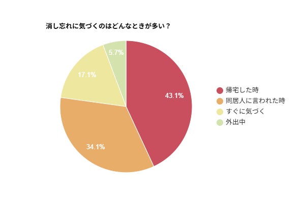 電気の消し忘れに気づくタイミングとして最も多かったのは、「帰宅した時」で、全体の43.1%を占めました。次いで多かったのは「同居人に言われた時」で、34.1%でした。