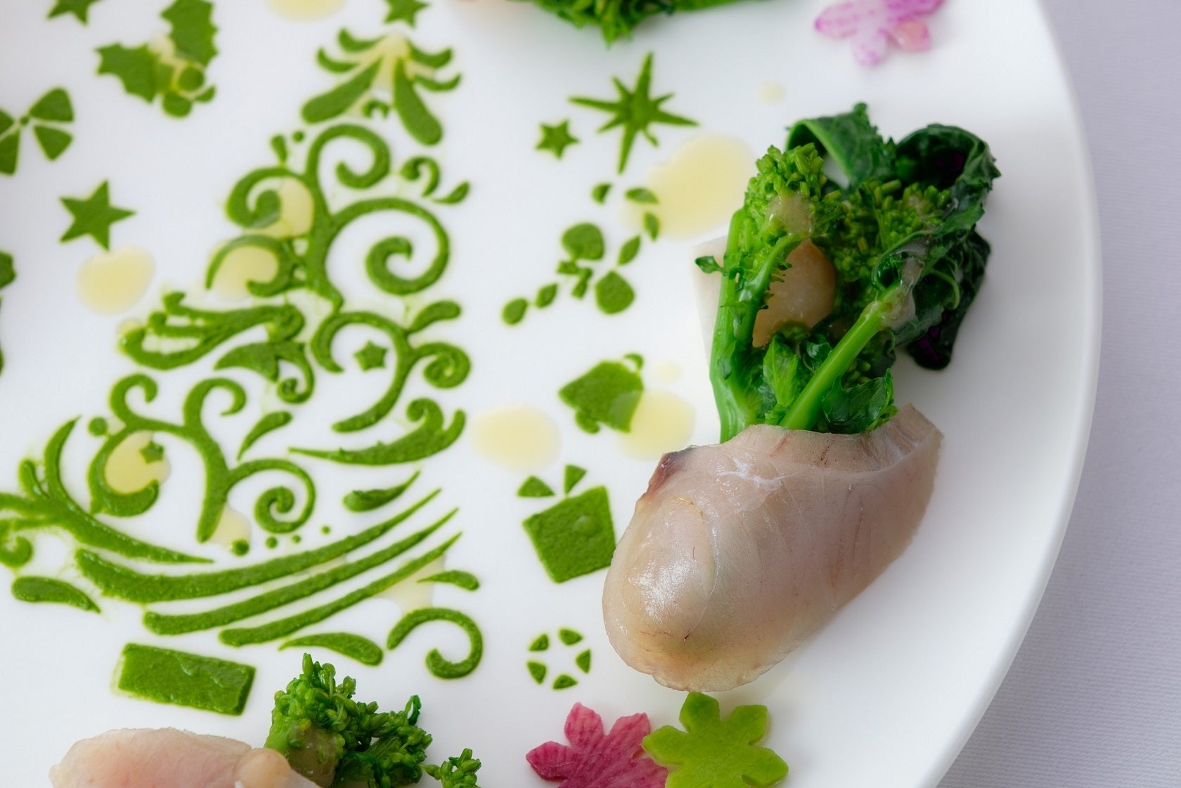 福岡県筑前町の「ふく福ファーム」から取り寄せたカラフルな大根やイタリア原産のカブ科の野菜、チーマディラーパに、豊後水道で揚ったサワラの生ハムを合わせた一品。しっとりとした食感に仕上がったサワラのほどよい塩味と、新鮮な野菜の甘味を一緒にお楽しみいただけます。お皿に描かれたクリスマスツリー柄の春菊のソースと合わせてお召し上がりください。