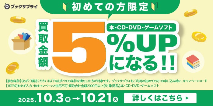 期間中にキャンペーンコード【ISTB9S】を入力してお申し込みいただくと、本・CD・DVD・ゲームソフトの買取金額が通常より5%アップします。