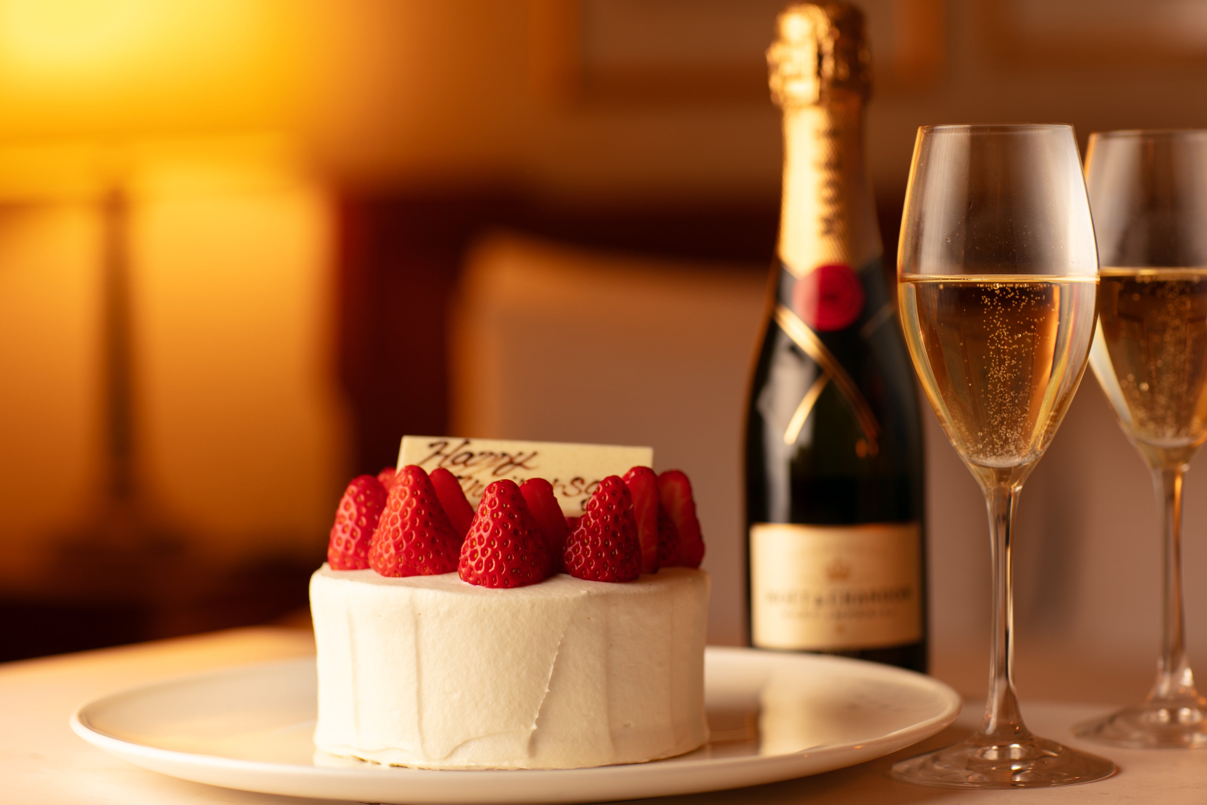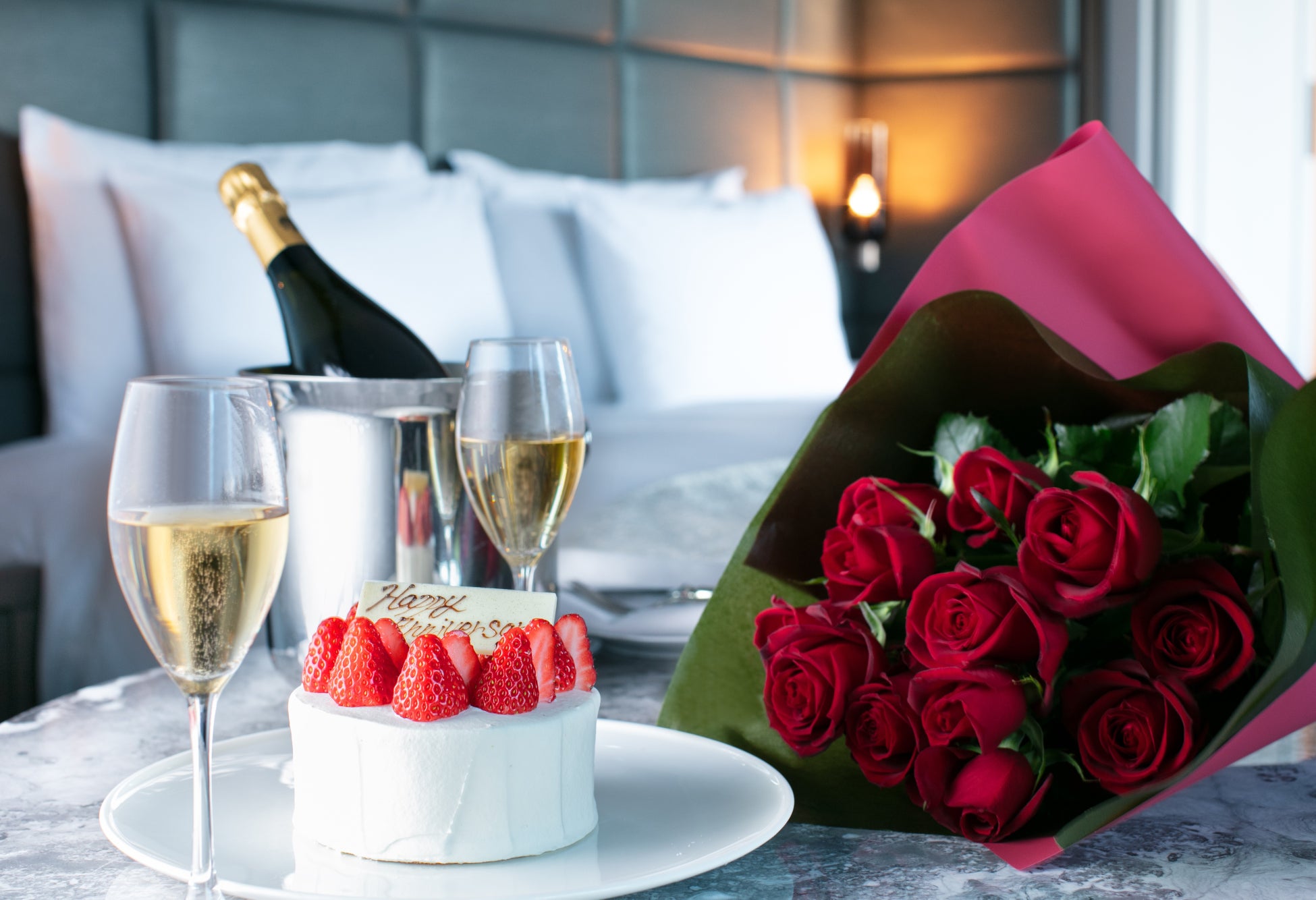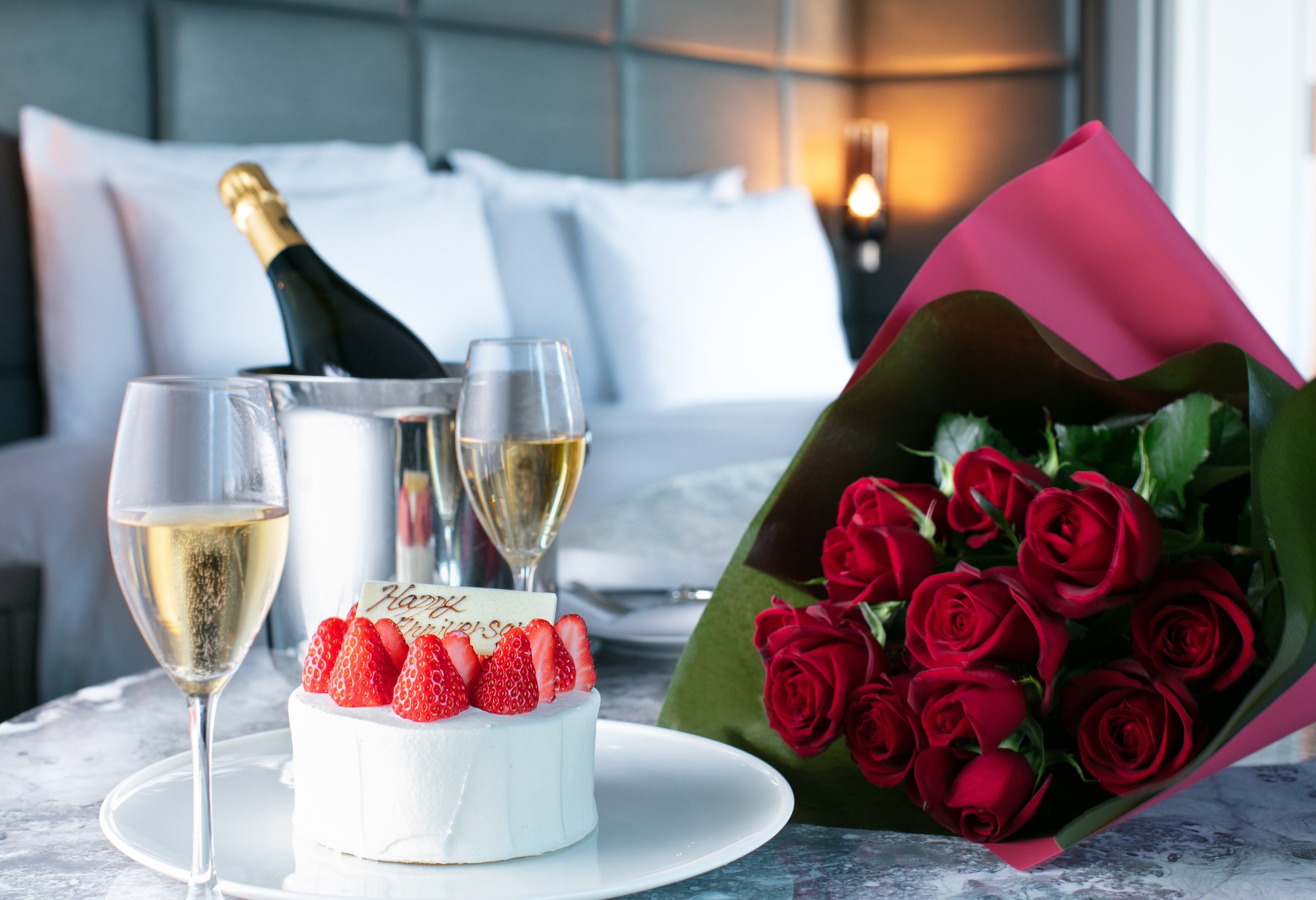 ケーキとシャンパンで祝う、心あたたまる記念日ステイ。朝食はルームサービスにてご準備。ゆったりとした優雅な朝のひとときをお過ごしいただけます。