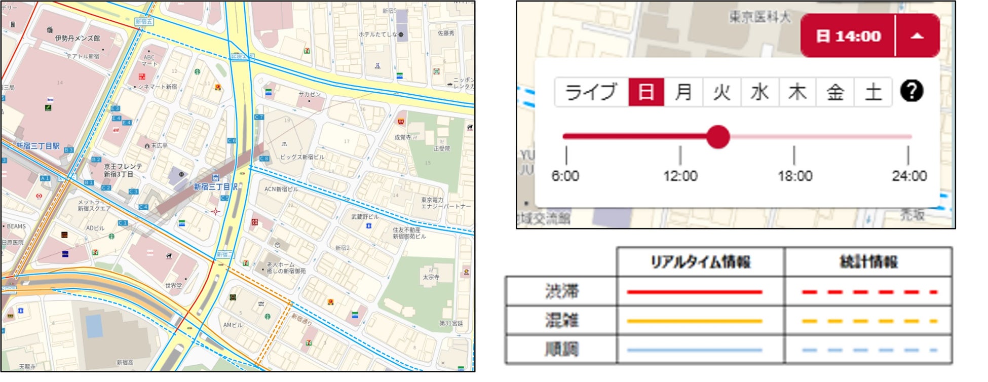 「曜日別渋滞情報β版」は、リアルタイムの渋滞情報と、指定した曜日・時間帯の渋滞統計情報を地図上に表示する新機能です。本機能には、自社が提供するポイ活アプリ「トリマ」からユーザーの許諾を得て取得した人流データをもとに独自開発した渋滞・渋滞統計データを活用しています。
