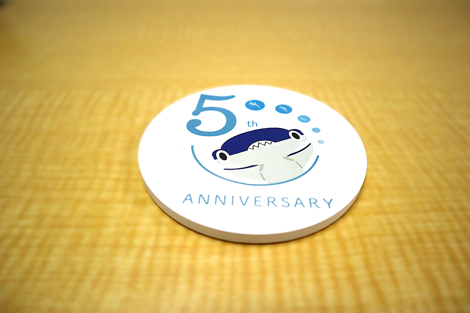 5周年記念ロゴデザインのコースターです。しっとりとした質感で吸収性にも優れている、白雲石を使用しており、下面にはコルク素材を使用した滑り止め加工が施されています。