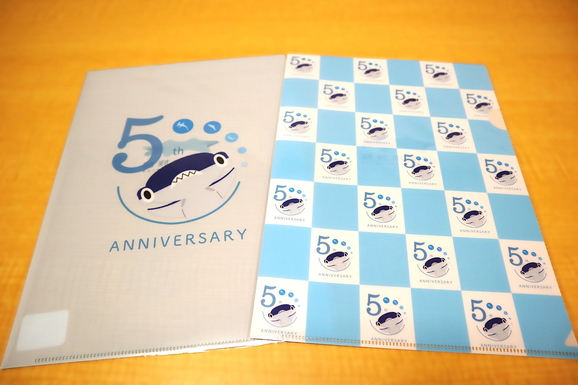 5周年記念ロゴデザインのクリアファイルです。ロゴのみのデザインと総柄デザインの2種類をご用意しました。