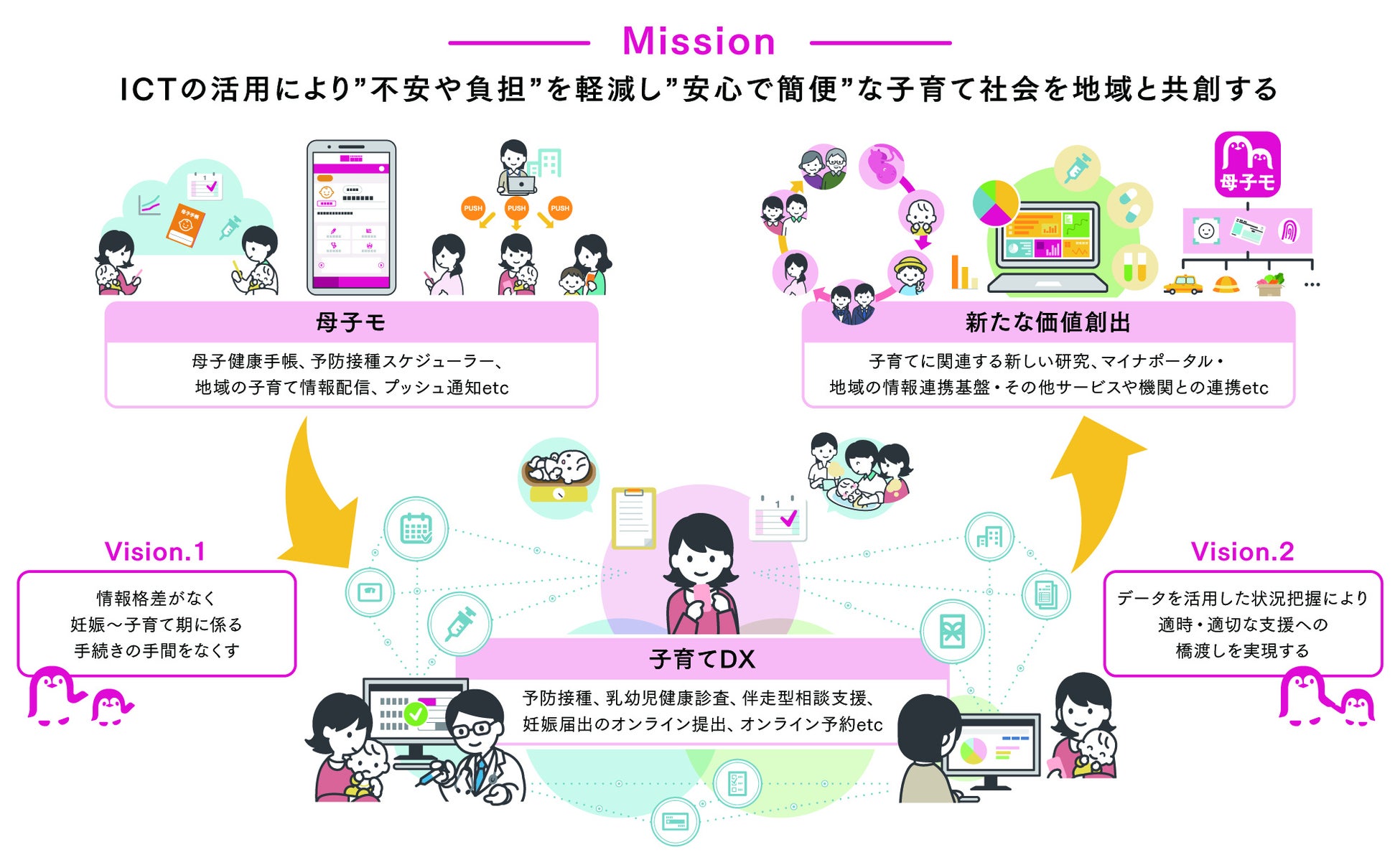 当社は、2030年までに、妊娠から子育て期の手続きについて、必要な人に情報を届け、保護者、自治体、医療機関の手間を無くすことをビジョンとして掲げています。子育て関連事業のデジタル化を支援するサービス『母子モ 子育てDX』※1では、厚生労働省の乳幼児の定期予防接種予診票のデジタル化に向けた地域実証※2を行い社会実装するなど、さまざまな子育て関連事業のDXを推進することで、保護者の“不安や負担”を軽減し、“安心で簡便”な子育て社会を地域と共創することを目指します。