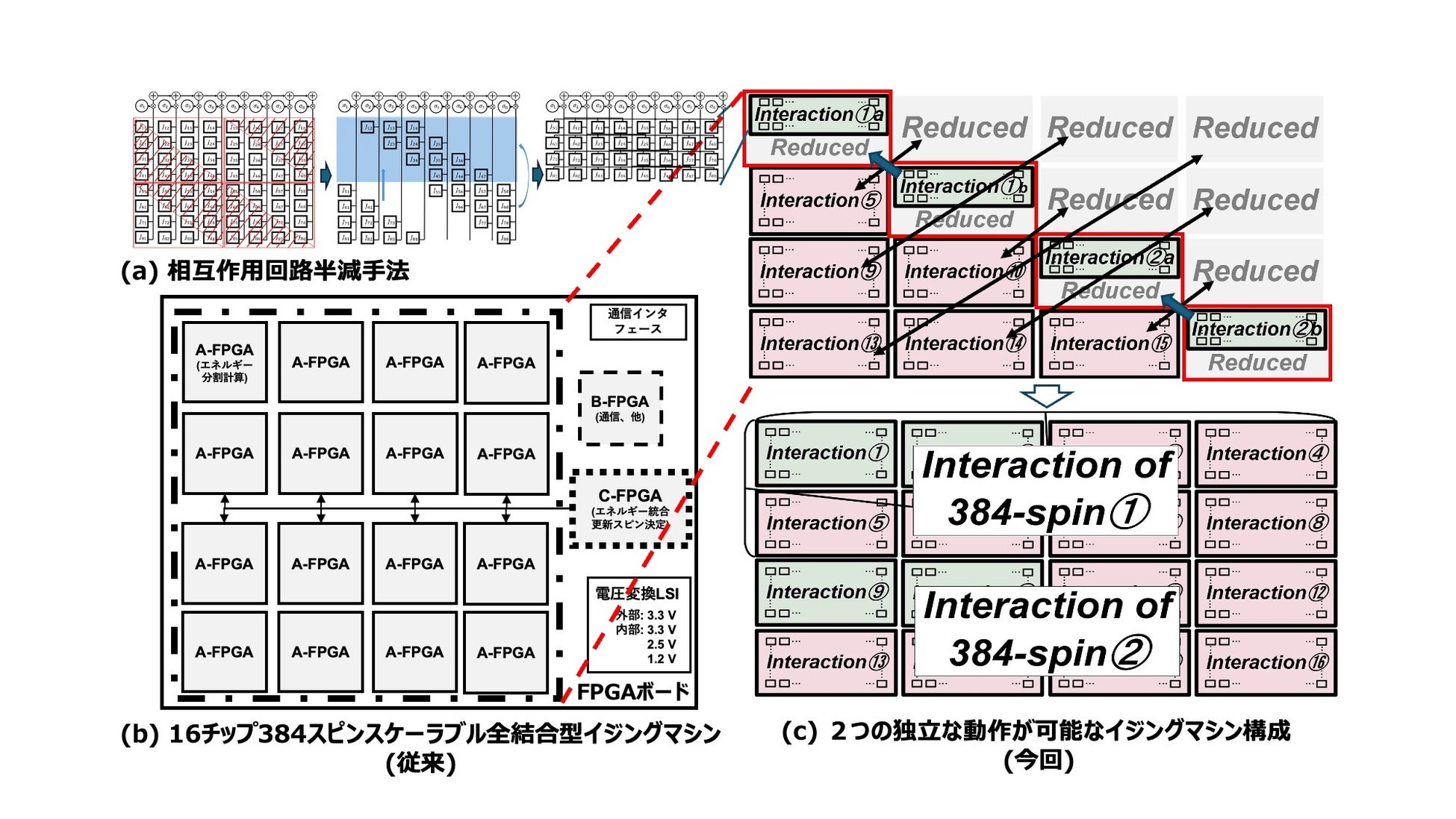 今回、これまでに研究チームが開発したスケーラブルな全結合型イジングマシンのボード上に、2つの独立した 384 スピン全結合型イジングマシンを実装することに成功しました。これにより、相互作用数を半減させることができます。