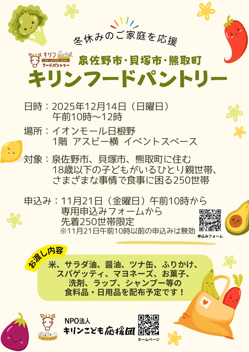 特定非営利活動法人キリンこども応援団(大阪府泉佐野市、代表 水取博隆)では、2025年12月14日(日)に泉佐野市・貝塚市・熊取町に在住するさまざまな事情で食事に困っているひとり親等の子育て世帯に対し、「キリンフードパントリー(食材配布)」を開催いたします。