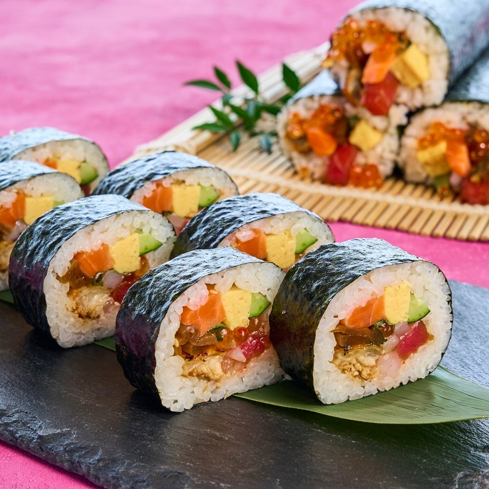 具材は、料理長秘伝の出汁醤油に漬けたまぐろに、しっとりと上質な脂がのったうなぎ、酢で〆たサーモン、いくら醤油漬け、金沢近海で水揚げされる甘えびの豪華5種の海鮮に、厚焼き玉子、きゅうり、大葉、かんぴょうの全9種。贅沢に大きく切った具材を大胆に巻き上げていきます。