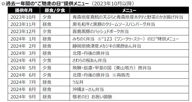 当社では、栄養バランスが整った食事を摂ることによる“体の栄養”に加え、“心の栄養”につながる取り組みとして、“ご馳走の日”を月に1回設けています。“ご馳走の日”には、各地域の食材やご当地メニューなどを取り入れた特別メニューを、通常のお弁当(普通食)と同じ577円(税込・おかずのみ)で提供。普段はなかなか食べる機会の少ない食材やメニューで、利用者が届くまでの待ち遠しさや誰かに自慢したくなる気持ちを感じられるお弁当になるよう心掛けています。