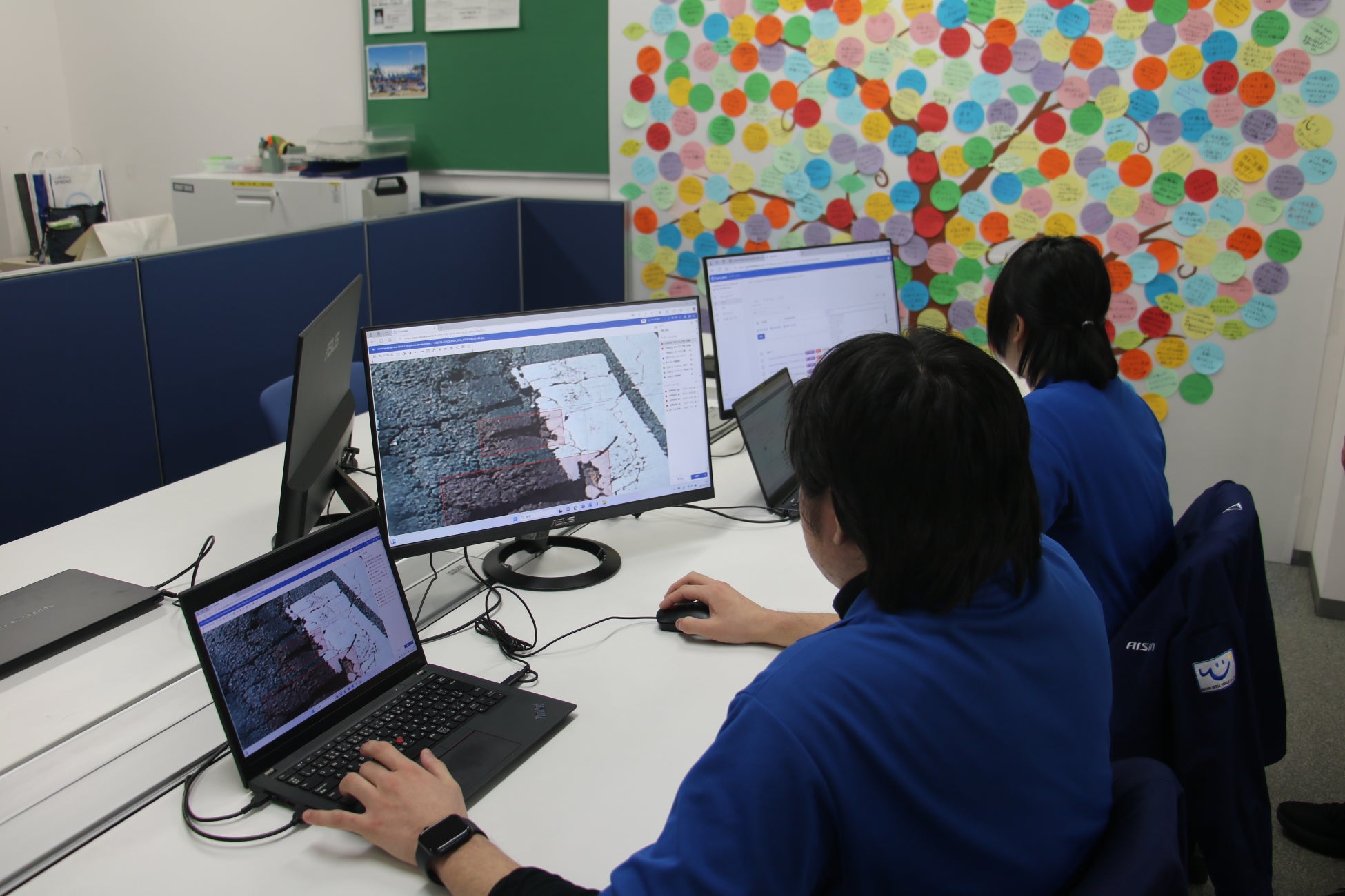 車両で収集した走行データや車載カメラで撮影した画像をもとにポットホールなどの道路の異常を検知して、補修に向けた計画支援、対策実施につなげる道路維持管理のトータルサービス。