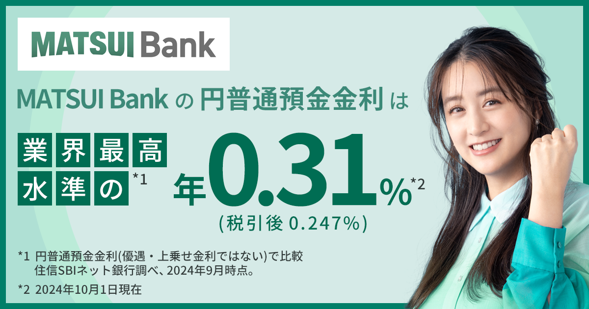 MATSUI Bank、円普通預金金利を業界最高水準 年0.31%(税引前)に引き上げ