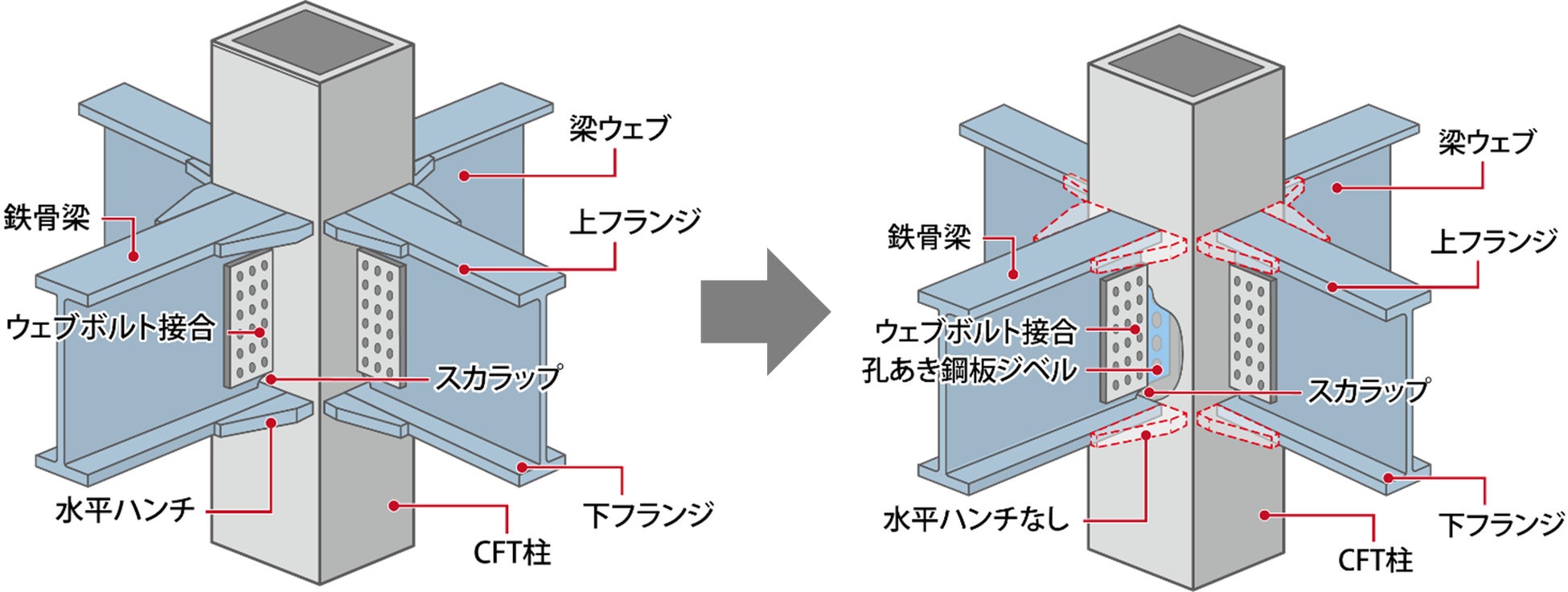 本工法は、CFT造柱の柱梁接合部の内部にジベルを溶接して取り付けます。柱内に打設したコンクリートがジベルを介して一体化することで、補強効果を得ることができます。この効果により、水平ハンチの取り付けが不要になります。その結果、柱周りのスペースを有効活用できることで設計の自由度が向上するとともに、現場での溶接作業量が軽減します。