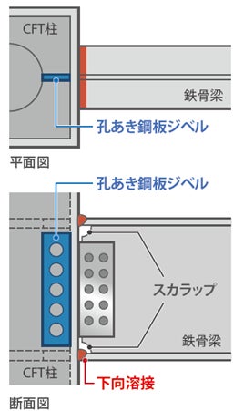 「鹿島式ストレート梁工法」では、CFT柱と鉄骨梁の接合部に、孔(あな)あき鋼板ジベル(以下、ジベル)※1を用いて接合部を補強する技術を活用します。これにより、梁端フランジに水平ハンチ※2を取り付けることなく、高い構造性能を確保しながら柱周りのスペースが広がります。