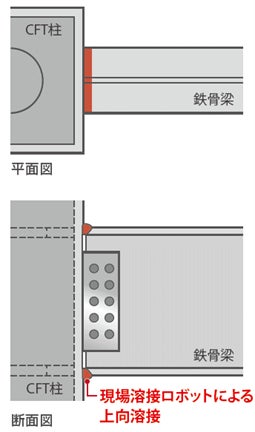 また、当社が開発した現場溶接ロボットによる梁下フランジの上向き溶接と組み合わせると、ジベルなしでも構造性能の向上が図れます。