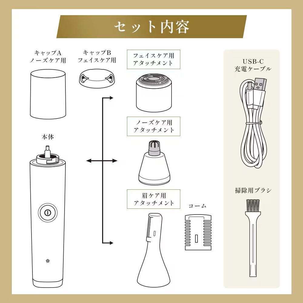 セット内容: 本体、フェイスケア用アタッチメント、ノーズケア用アタッチメント、眉ケア用アタッチメント、コーム、掃除用ブラシ、USB-C充電ケーブル