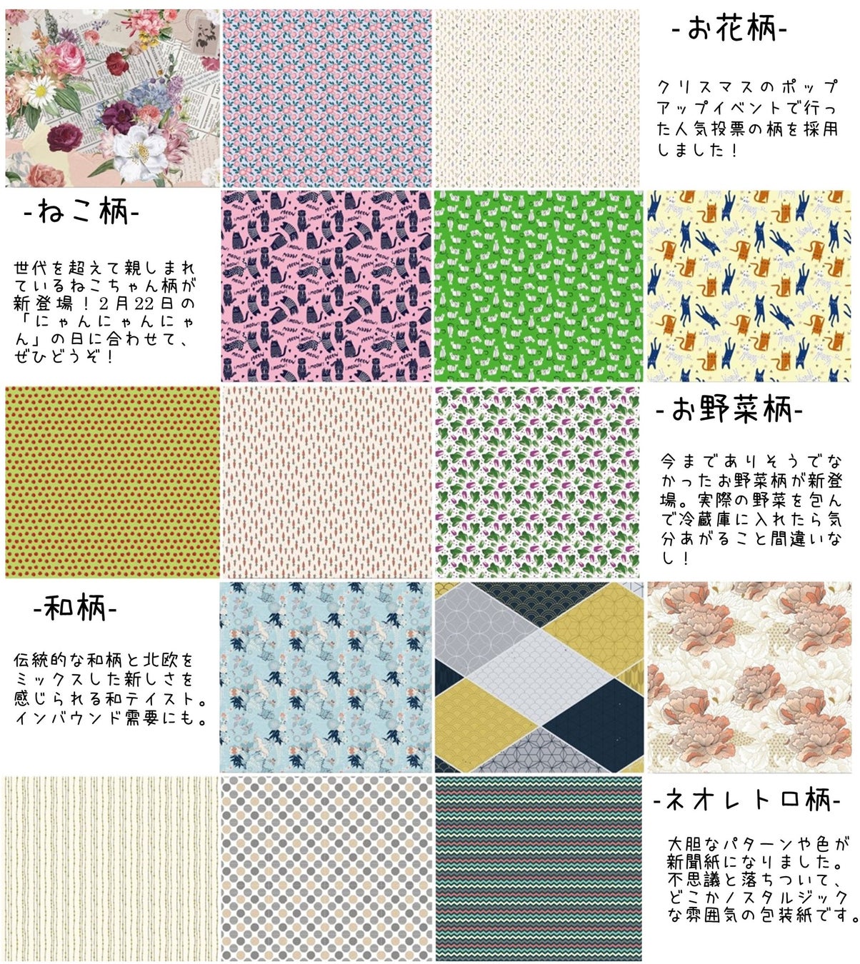 今回、新たに「お花」「ねこ」「お野菜」「和」「ネオレトロ」の5柄に