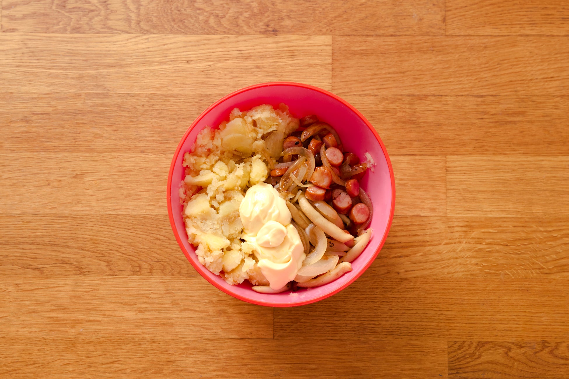 ②玉ねぎ、スライスウインナー、ぶなしめじを炒め①と混ぜ、マヨネーズを加える。