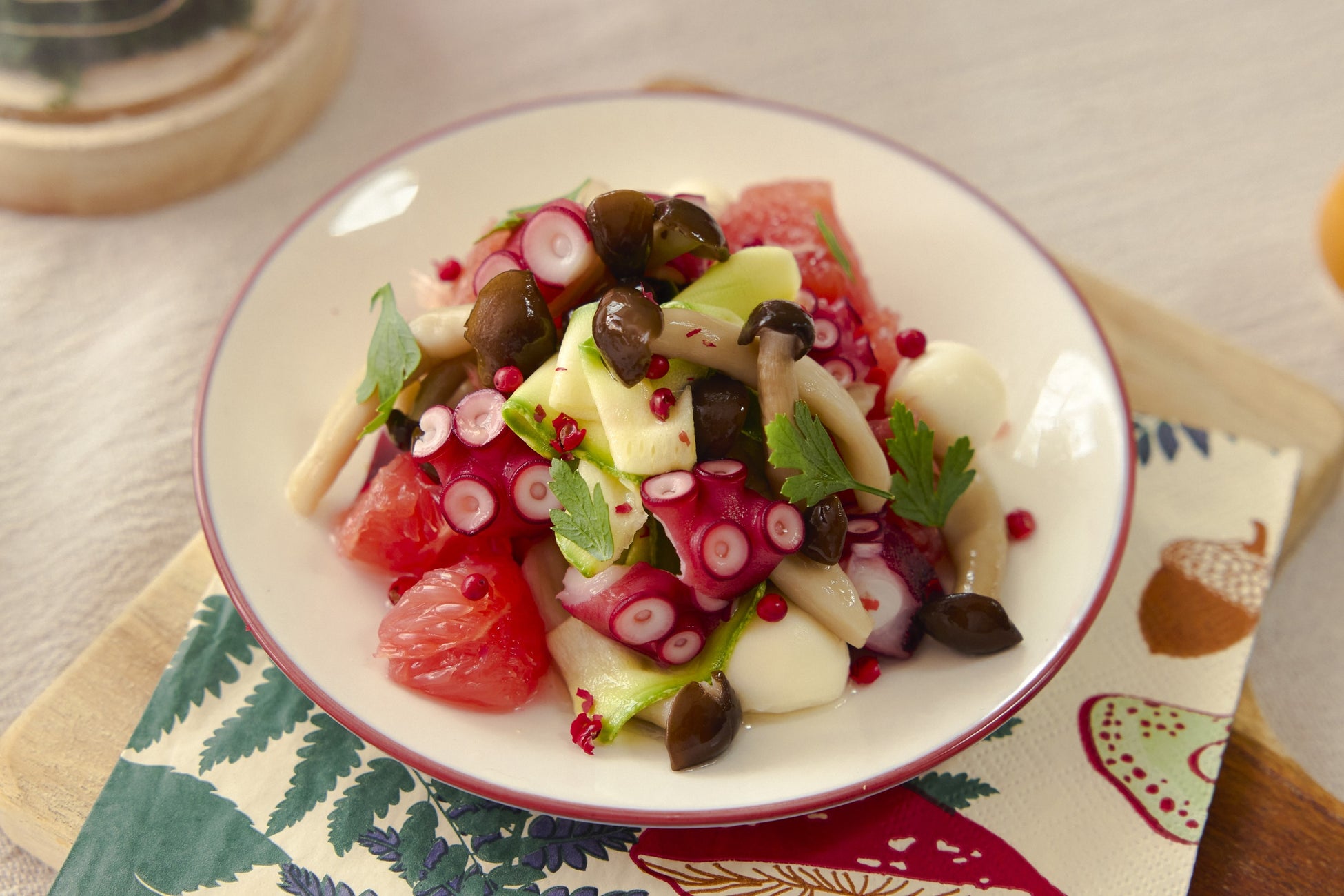 E. しめじとピンクグレープフルーツ・ズッキーニ・モッツアレラの爽やかマリネ