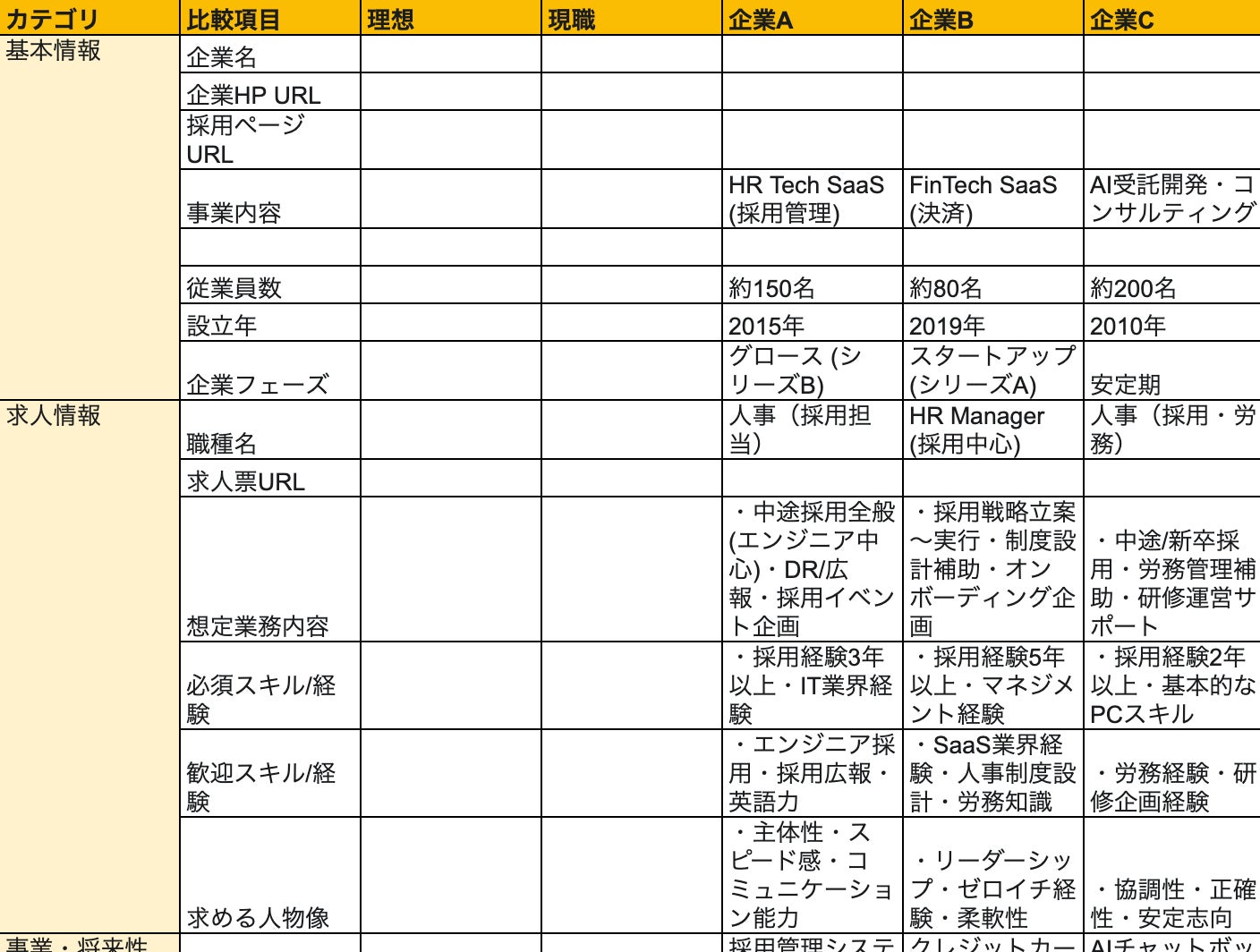 本シートは、複数の応募企業・検討企業について、人事職として押さえておくべき項目を体系的に整理し、客観的な比較を可能にするツールです。