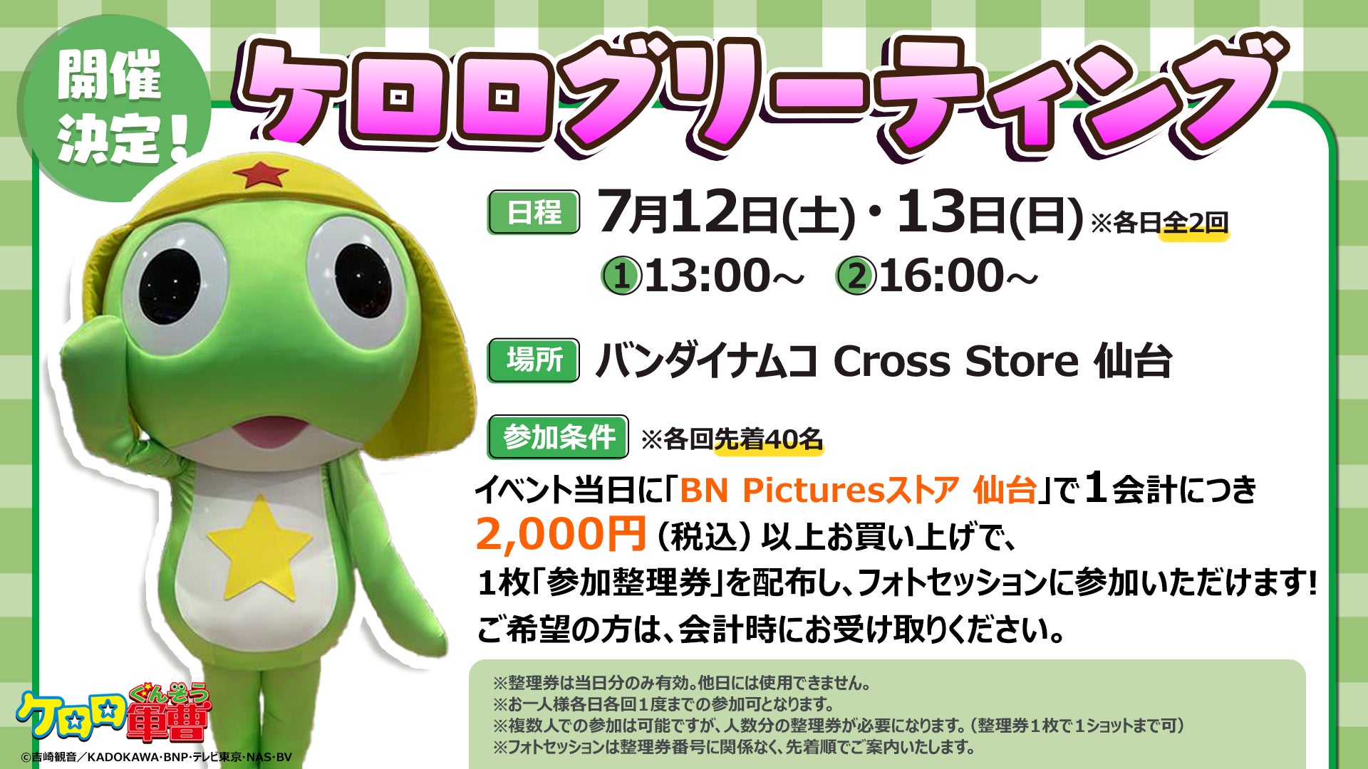 7月12日(土)、7月13日(日)にBN Picturesストア 仙台で2,000円(税込)以上お買い上げ頂いた方は、当日キャラクターグリーティングに参加頂けます!ご希望の方は会計時に整理券をお受け取り下さい。