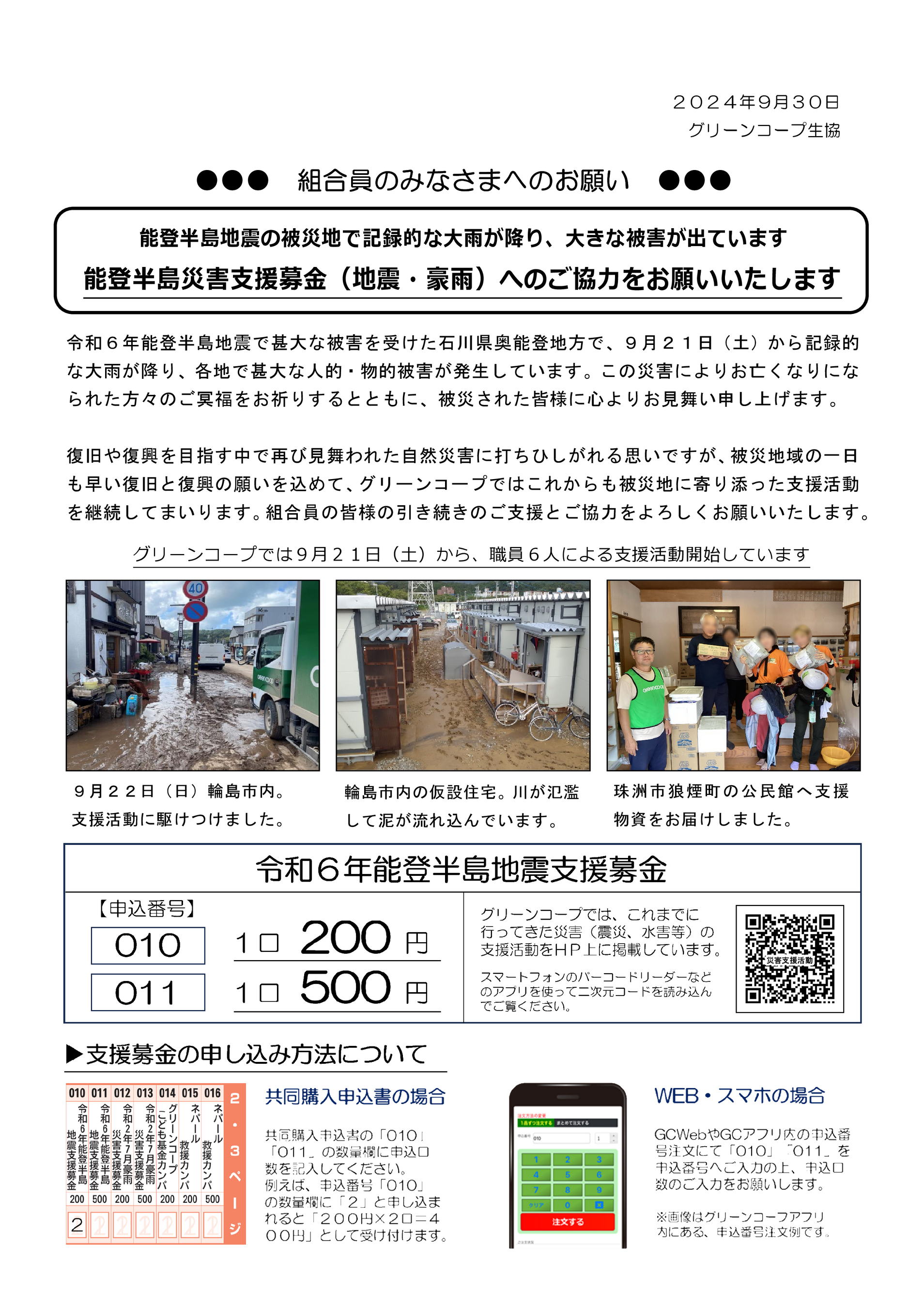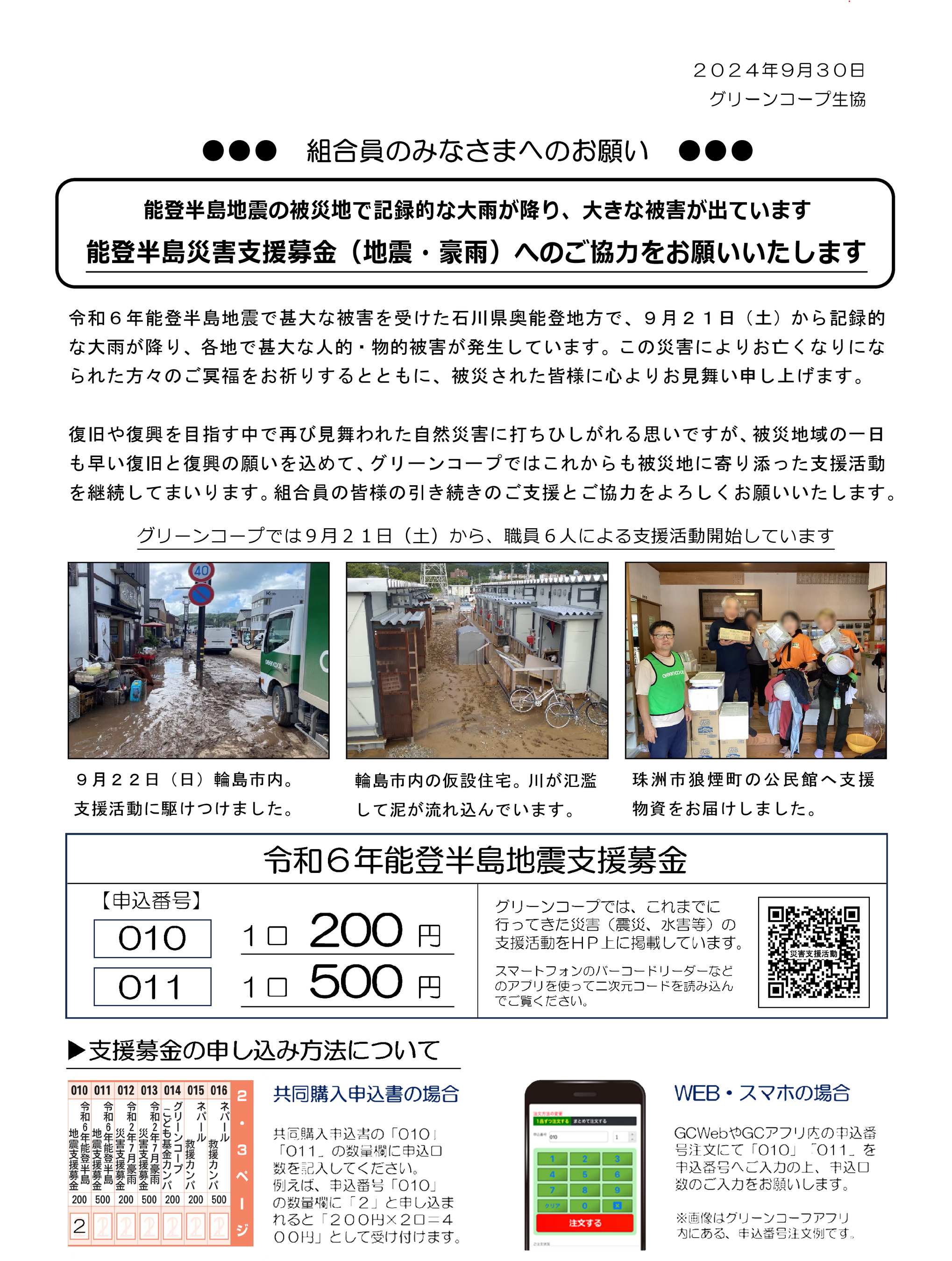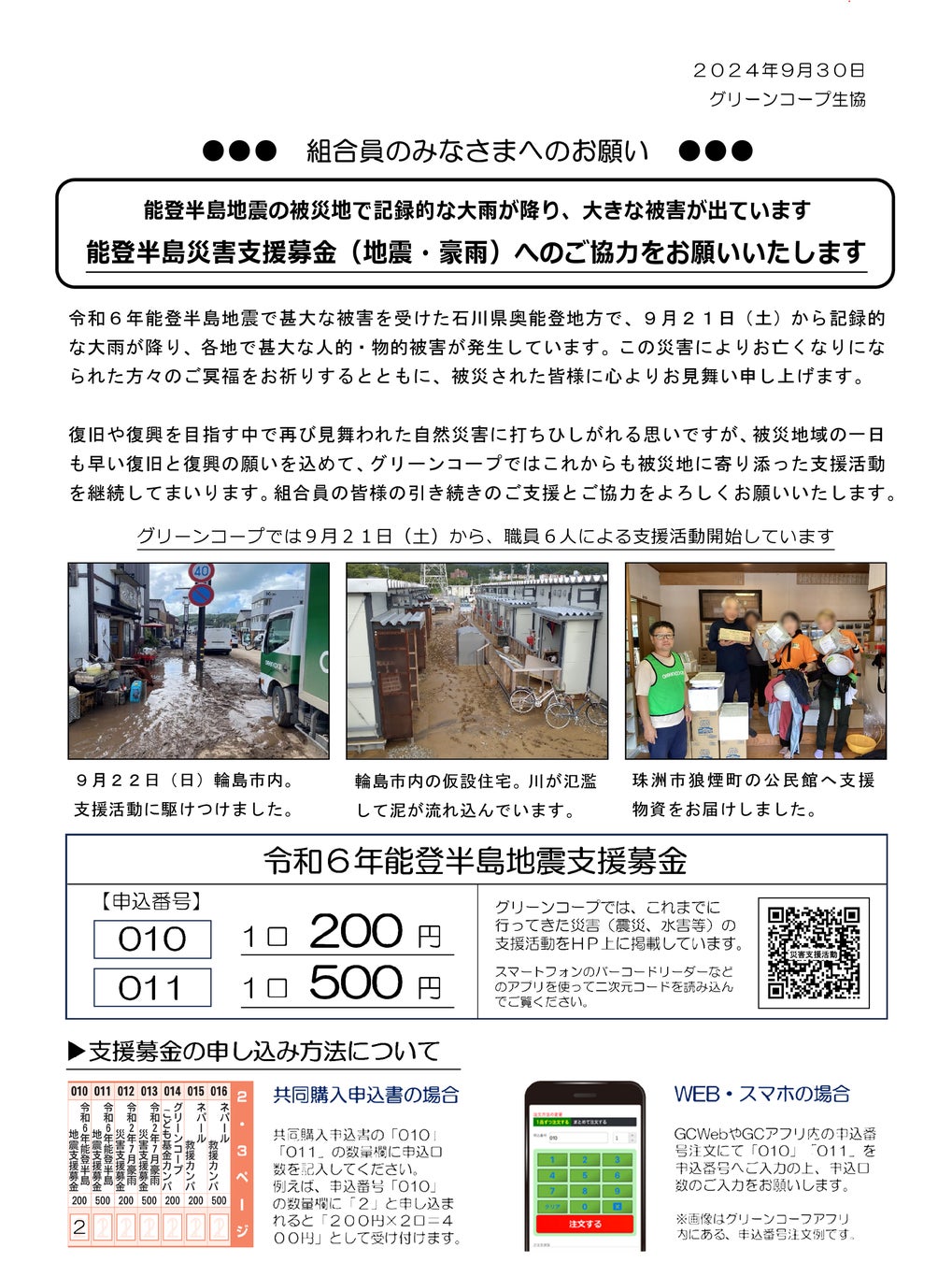 9月30日(月)より、グリーンコープの43万人の組合員へ支援募金を呼びかけます。支援金については、被災者・被災地域の支援・復旧活動に役立てていきます。