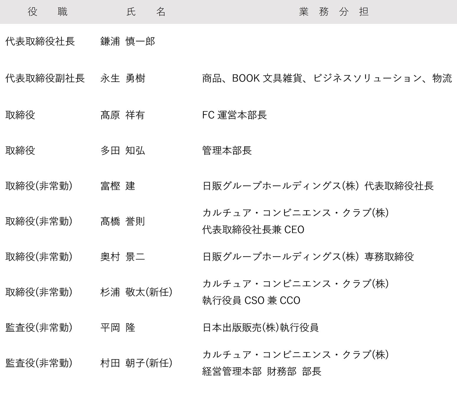カルチュア・エクスペリエンス株式会社(本社:東京都千代田区、代表取締役社長 鎌浦 慎一郎)は、4月1日に開催した臨時株主総会において、2025年度の経営体制を決議致しました。