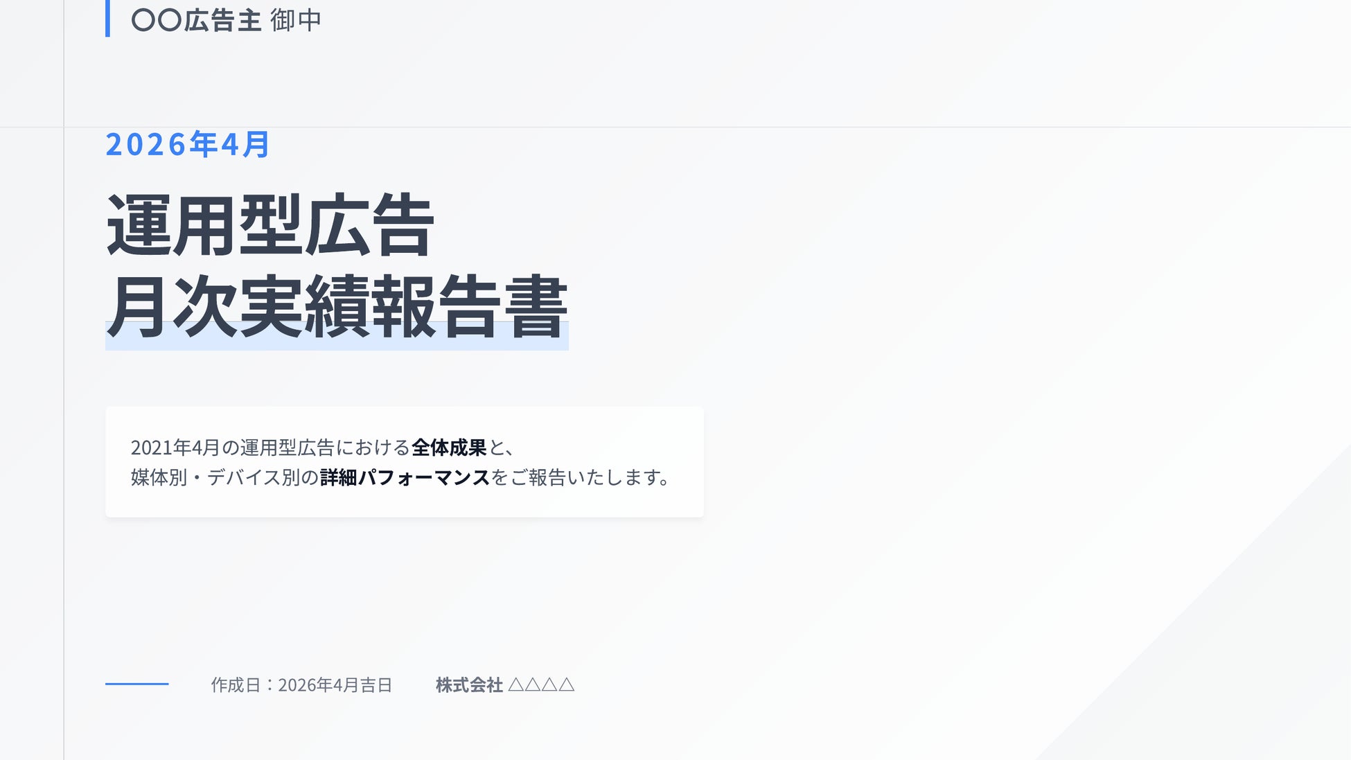 2つ目は「月次レポートスライド」です。クライアントを対象に、広告運用の成果をグラフ・数値で報告するスライドを生成できるサンプルです。毎月、全クライアント分のレポートスライドを作成する必要があるものの、クライアント数が増えるほどレポーティング作業に時間が取られ、施策改善に集中しにくくなるという課題に対応しており、広告運用レポートPDFやリサーチデータを素材として投入するだけで、成果が可視化された月次レポートスライドを効率的に作成することが可能です。レポーティング業務の負担を軽減し、施策の分析や改善提案により多くの時間を確保できます。