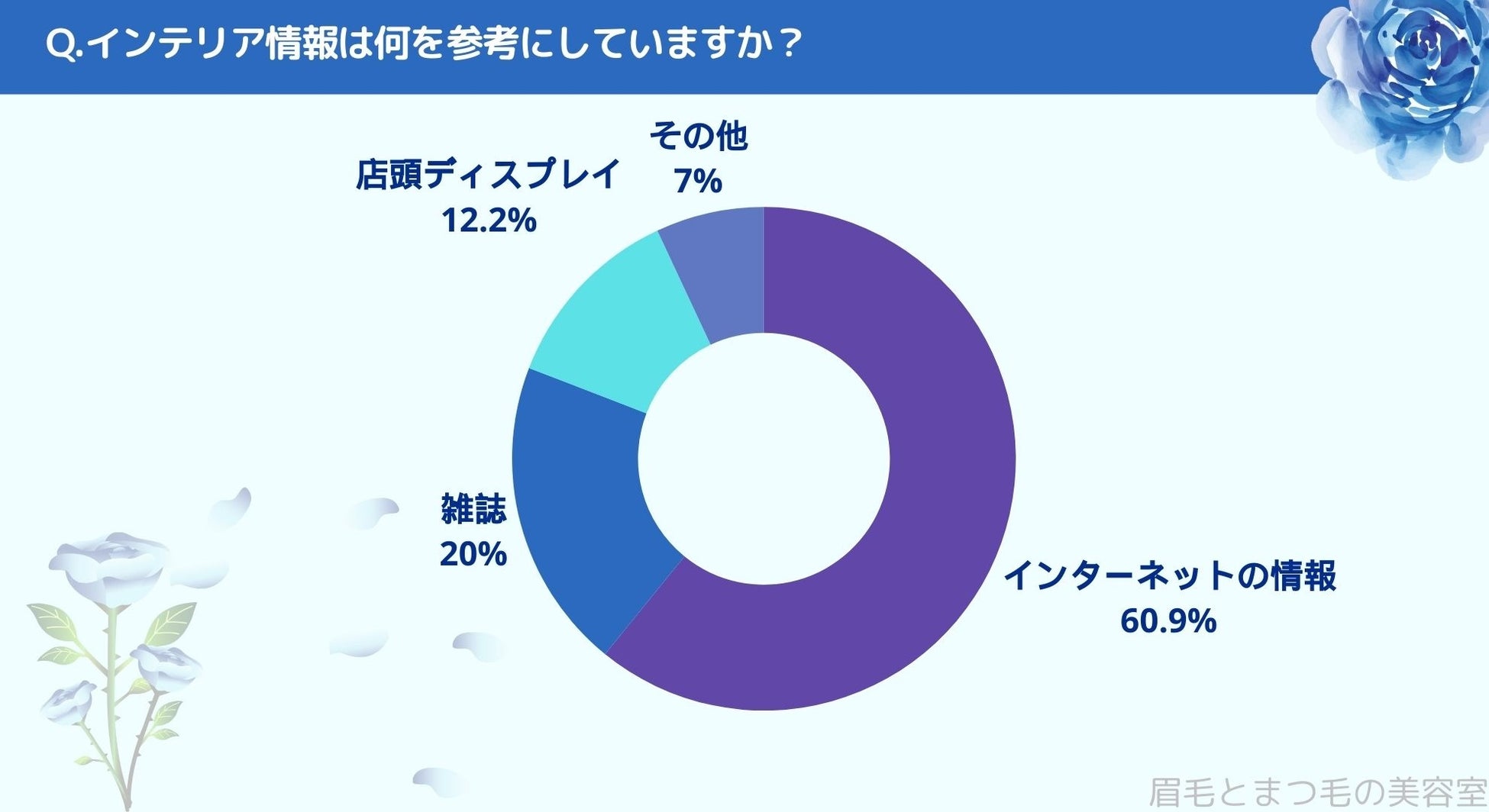 インテリアの情報は何を参考にしているかお聞きしたところ「インターネットの情報(60.9%)」、「雑誌(20%)」、「店頭ディスプレイ(12.2%)」、「その他(7%)」という結果になりました。