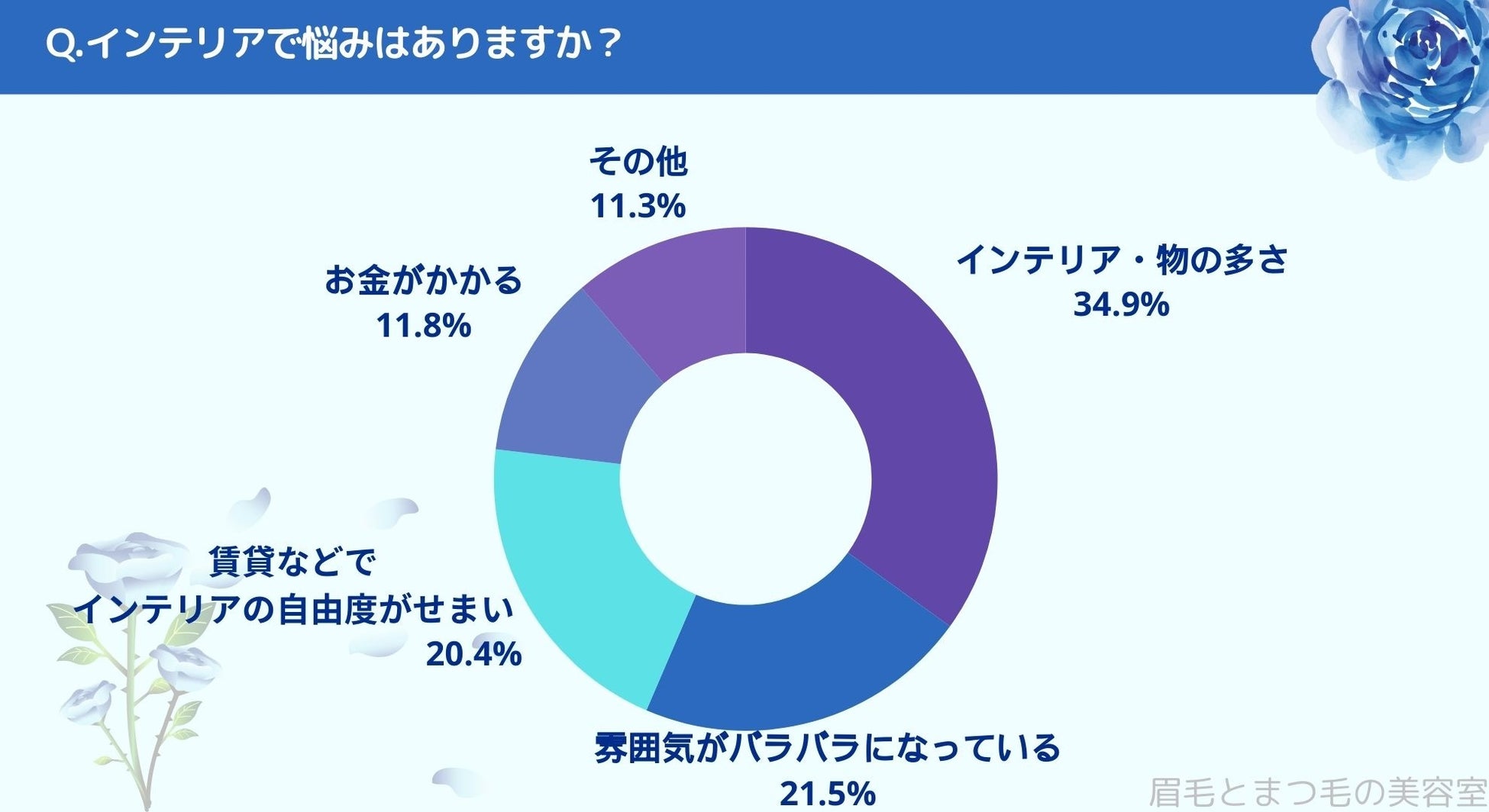 インテリアで悩みがあるかお聞きしたところ「インテリア・物の多さ(34.9%)」、「雰囲気がばらばらになっている(21.5%)」、「賃貸などでインテリアの自由度がせまい(20.4%)」、「お金がかかる(11.8%)」という結果になりました。