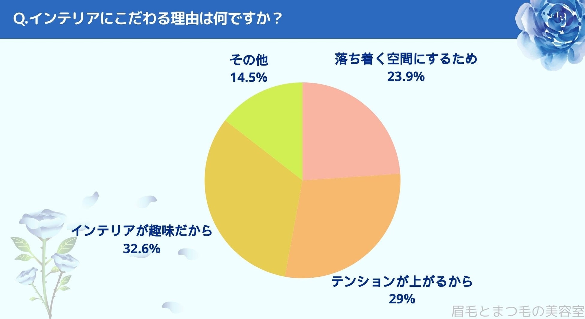 インテリアにこだわる理由をお聞きしたところ「落ち着く空間にするため(23.9%)」、「テンションが上がるから(29%)」、「インテリアが趣味だから(32.6%)」、「その他(14.5%)」という結果になりました。